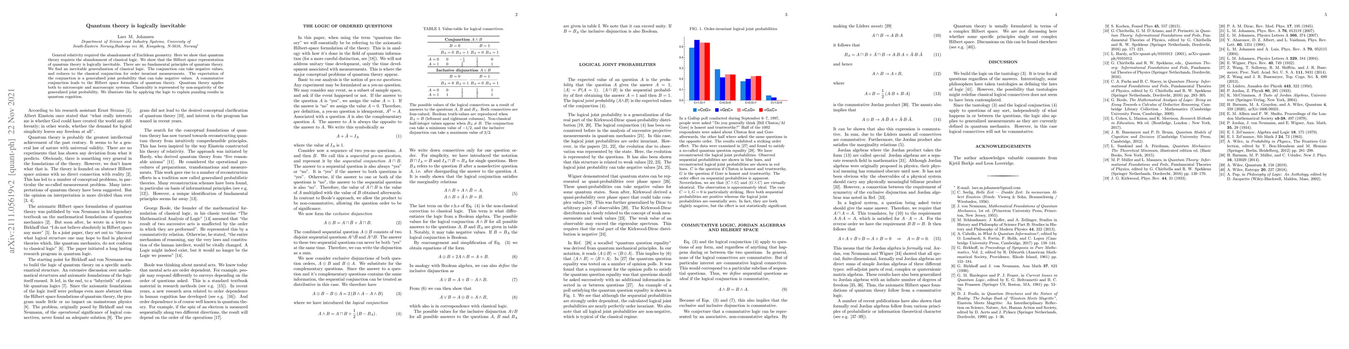 General relativity required the abandonment of Euclidean geometry. Here we show that quantum theory requires the abandonment of classical logic. We show that the Hilbert space representation of quantum theory is logically inevitable. There are no fundamental principles of quantum theory. We find an inevitable generalization of classical logic. The conjunction can take negative values, and reduces to the classical conjunction for order invariant measurements. The expectation of the conjunction is a generalized joint probability that can take negative values. A commutative conjunction leads to the Hilbert space formalism of quantum theory. Quantum theory applies both to microscopic and macroscopic systems. Classicality is represented by non-negativity of the generalized joint probability. We illustrate this by applying the logic to explain puzzling results in quantum cognition.