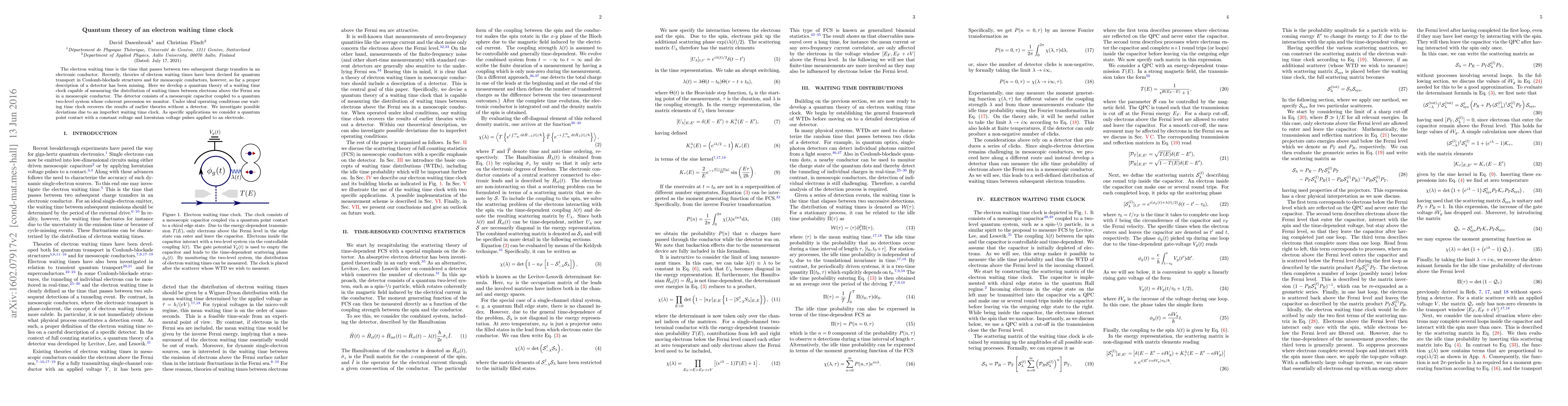This paper develops a quantum theory for a waiting time clock to measure electron waiting times in mesoscopic conductors, utilizing a mesoscopic capacitor coupled to a quantum two-level system. The study investigates deviations from ideal conditions and applies the theory to quantum point contacts under constant voltage and lorentzian pulses.
