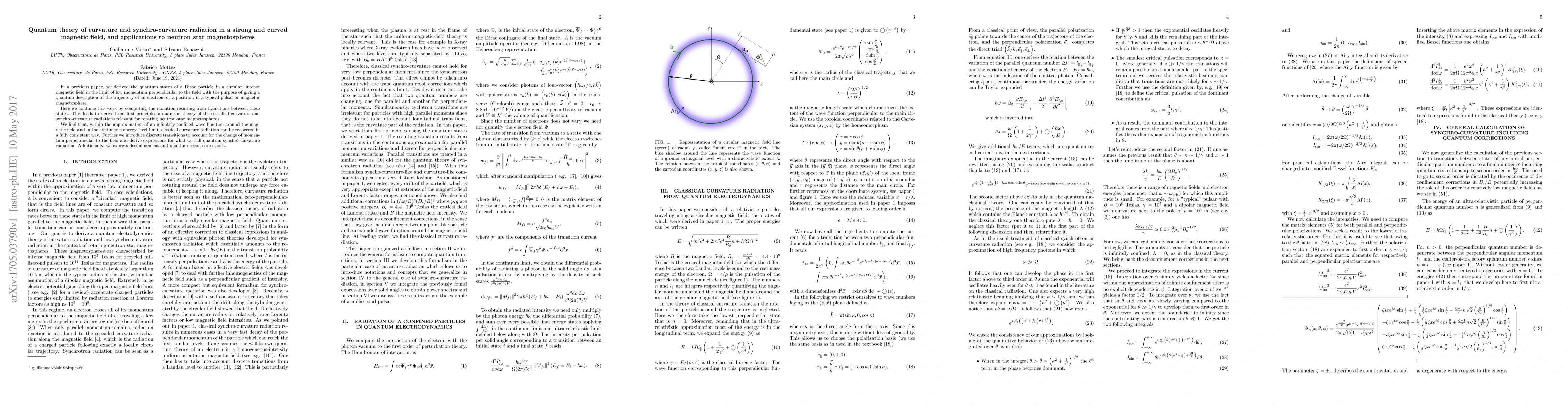 In a previous paper, we derived the quantum states of a Dirac particle in a circular, intense magnetic field in the limit of low momentum perpendicular to the field with the purpose of giving a quantum description of the trajectory of an electron, or a positron, in a typical pulsar or magnetar magnetosphere. Here we continue this work by computing the radiation resulting from transitions between these states. This leads to derive from first principles a quantum theory of the so-called curvature and synchro-curvature radiations relevant for rotating neutron-star magnetospheres. We find that, within the approximation of an infinitely confined wave-function around the magnetic field and in the continuous energy-level limit, classical curvature radiation can be recovered in a fully consistent way. Further we introduce discrete transitions to account for the change of momentum perpendicular to the field and derive expressions for what we call quantum synchro-curvature radiation. Additionally, we express deconfinement and quantum recoil corrections.