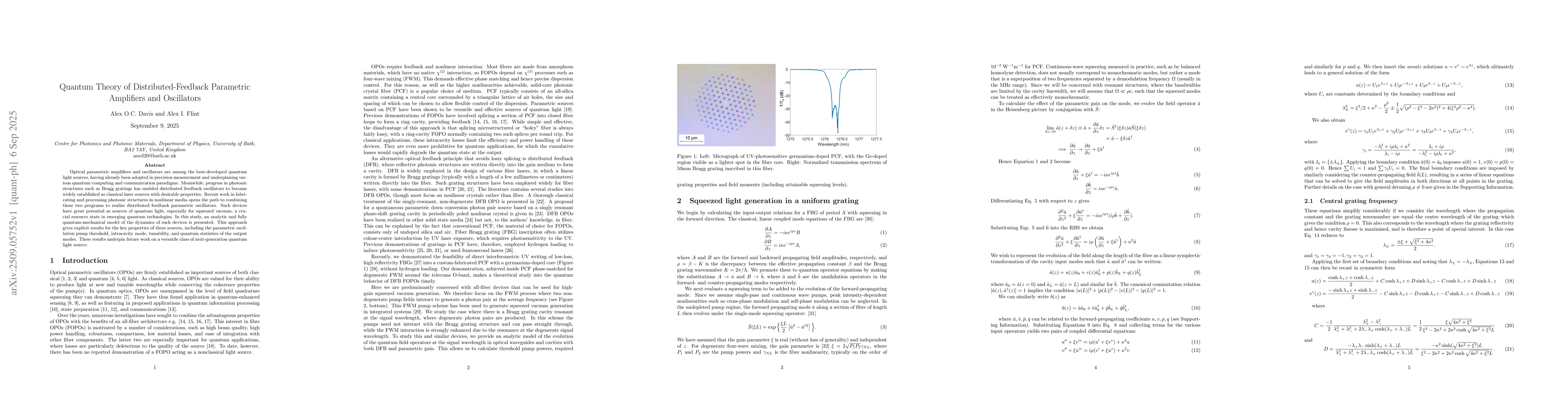 Optical parametric amplifiers and oscillators are among the best-developed quantum light sources, having already been adopted in precision measurement and underpinning various quantum computing and communication paradigms. Meanwhile, progress in photonic structures such as Bragg gratings has enabled distributed feedback oscillators to become widely established as classical laser sources with desirable properties. Recent work in fabricating and processing photonic structures in nonlinear media opens the path to combining these two programs to realize distributed feedback parametric oscillators. Such devices have great potential as sources of quantum light, especially for squeezed vacuum, a crucial resource state in emerging quantum technologies. In this study, an analytic and fully quantum-mechanical model of the dynamics of such devices is presented. This approach gives explicit results for the key properties of these sources, including the parametric oscillation pump threshold, intracavity mode, tunability, and quantum statistics of the output modes. These results underpin future work on a versatile class of next-generation quantum light source.