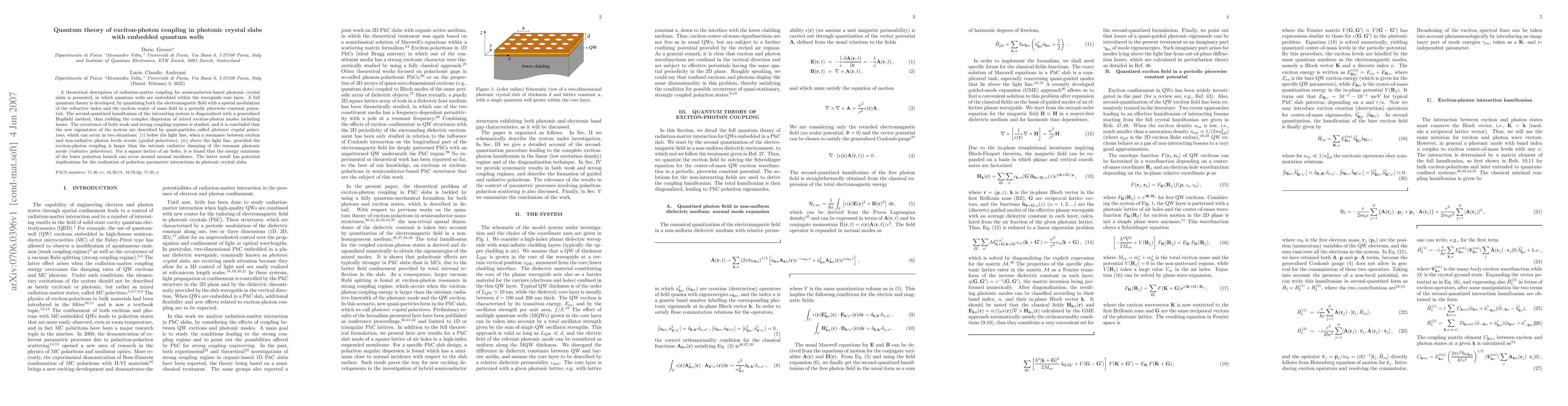 This paper develops a quantum theory for exciton-photon coupling in photonic crystal slabs with embedded quantum wells, revealing the emergence of quasi-particles called photonic crystal polaritons. The study identifies two coupling regimes and potential applications for polariton parametric interactions.