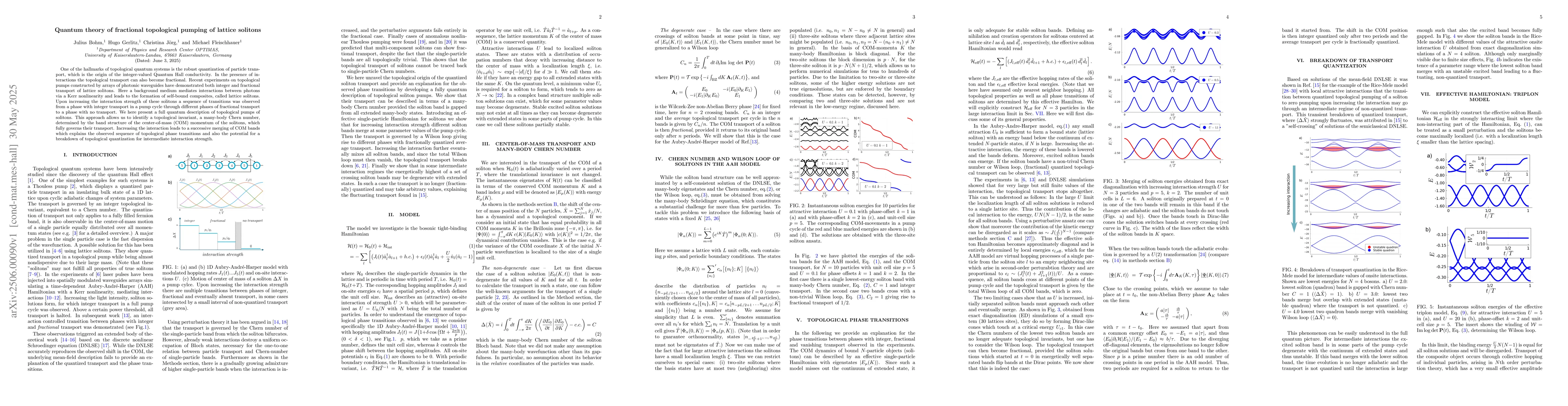 This research distinguishes itself by providing a quantum mechanical description of fractional topological transport in lattice solitons, identifying a many-body Chern number as a governing topological invariant, and explaining observed phase transitions through band merging.