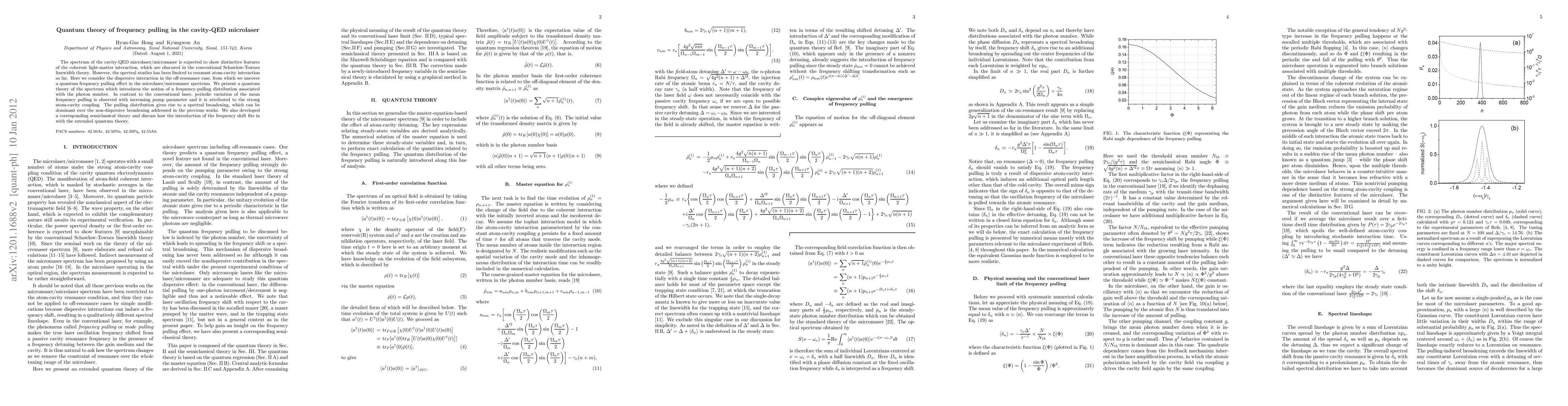 This paper presents a quantum theory for the spectrum of cavity-QED microlasers, revealing a quantum frequency pulling effect due to dispersive interactions. The study shows that frequency pulling varies periodically with pump strength, leading to significant spectral broadening.
