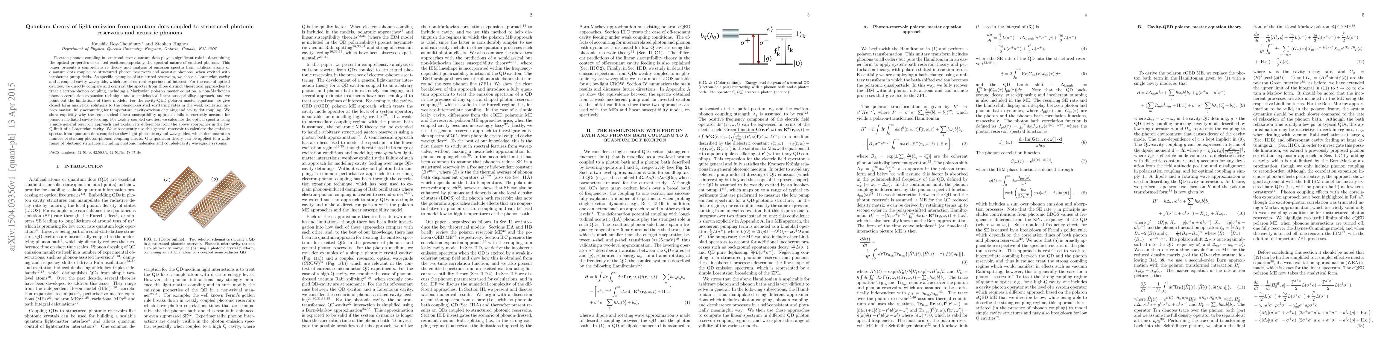 Electron-phonon coupling in semiconductor quantum dots plays a significant role in determining the optical properties of excited excitons, especially the spectral nature of emitted photons. This paper presents a comprehensive theory and analysis of emission spectra from artificial atoms or quantum dots coupled to structured photon reservoirs and acoustic phonons, when excited with incoherent pump fields. As specific examples of structured reservoirs, we chose a Lorentzian cavity and a coupled cavity waveguide, which are of current experimental interest. For the case of optical cavities, we directly compare and contrast the spectra from three distinct theoretical approaches to treat electron-phonon coupling, including a Markovian polaron master equation, a non-Markovian phonon correlation expansion technique and a semiclassical linear susceptibility approach, and we point out the limitations of these models. For the cavity-QED polaron master equation, we give closed form analytical solutions to the phonon-assisted scattering rates in the weak excitation approximation, fully accounting for temperature, cavity-exciton detuning and cavity dot coupling. We show explicitly why the semiclassical linear susceptibility approach fails to correctly account for phonon-mediated cavity feeding. For weakly coupled cavities, we calculate the optical spectra using a more general reservoir approach and explain its differences from the above approaches in the low Q limit of a Lorentzian cavity. We subsequently use this general reservoir to calculate the emission spectra from quantum dots coupled to slow-light photonic crystal waveguides, which demonstrate a number of striking photon-phonon coupling effects. Our quantum theory can be applied to a wide range of photonic structures including photonic molecules and coupled-cavity waveguide systems.