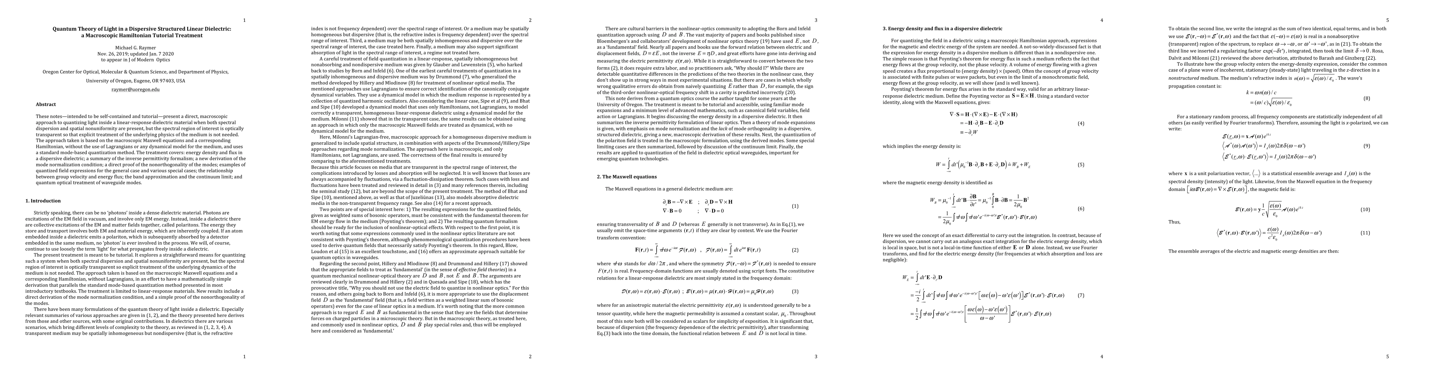 This paper provides a tutorial on quantizing light in a dispersive structured linear dielectric using macroscopic Maxwell equations and a Hamiltonian approach, focusing on energy density, mode normalization, and quantum optical waveguide modes without dynamical models for the medium.