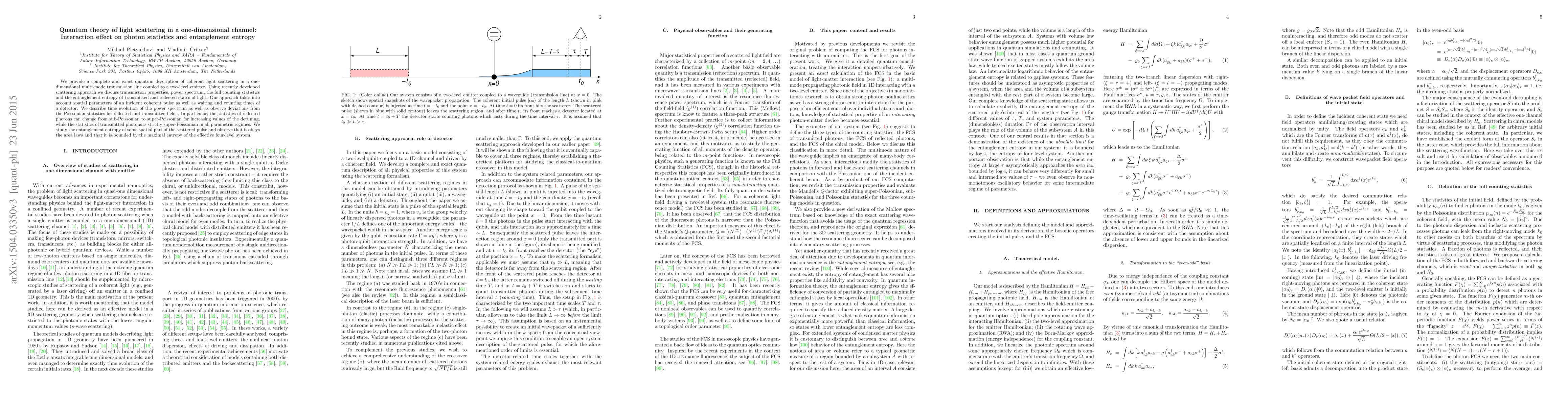 This paper presents a quantum description of coherent light scattering in a one-dimensional channel, detailing transmission properties, photon statistics, and entanglement entropy. It reveals deviations from Poissonian statistics for reflected photons and strictly super-Poissonian statistics for transmitted photons, while also observing area law compliance for entanglement entropy.