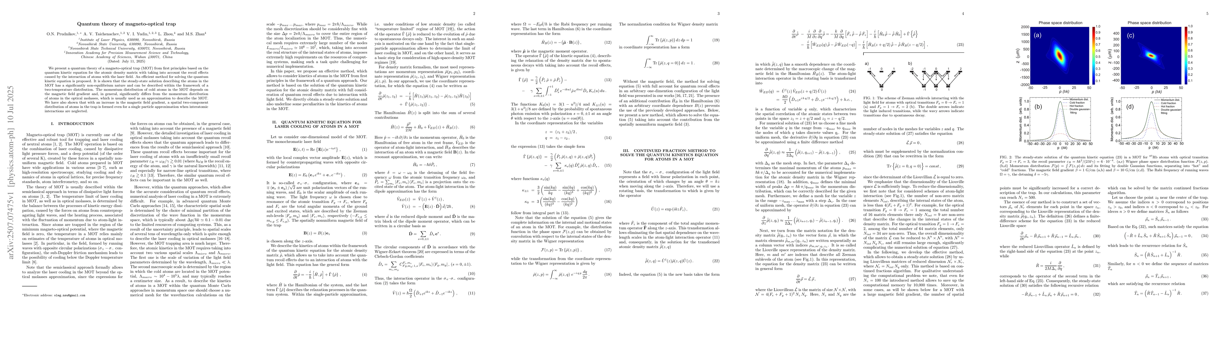 We present a quantum theory of a magneto-optical trap (MOT) from first principles based on the quantum kinetic equation for the atomic density matrix with taking into account the recoil effects caused by the interaction of atoms with the laser field. An efficient method for solving the quantum kinetic equation is proposed. It is shown that the steady-state solution describing the atoms in the MOT has a significantly non-equilibrium nature and can be described within the framework of a two-temperature distribution. The momentum distribution of cold atoms in the MOT depends on the magnetic field gradient and, in general, significantly differs from the momentum distribution of atoms in the optical molasses, which is usually used as an approximation to describe the MOT. We have also shown that with an increase in the magnetic field gradient, a spatial two-component distribution of atoms in the trap is formed even for a single particle approximation when interatomic interactions are neglected.