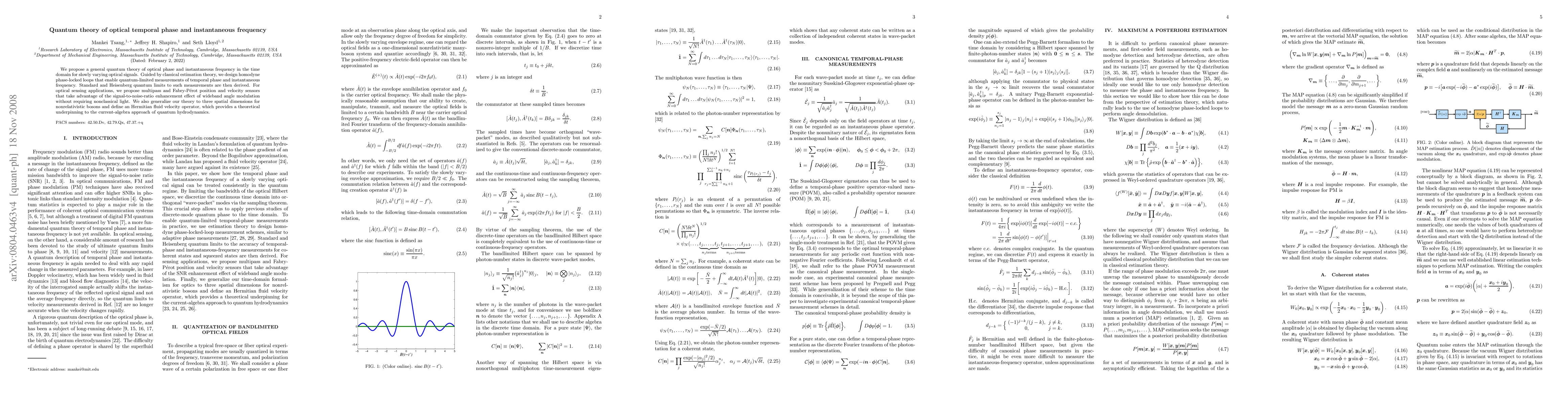 This paper develops a quantum theory for optical temporal phase and instantaneous frequency, proposing quantum-limited measurement techniques using homodyne phase-locked loops. It also introduces optical sensing applications based on wideband angle modulation and extends the theory to three spatial dimensions for nonrelativistic bosons.