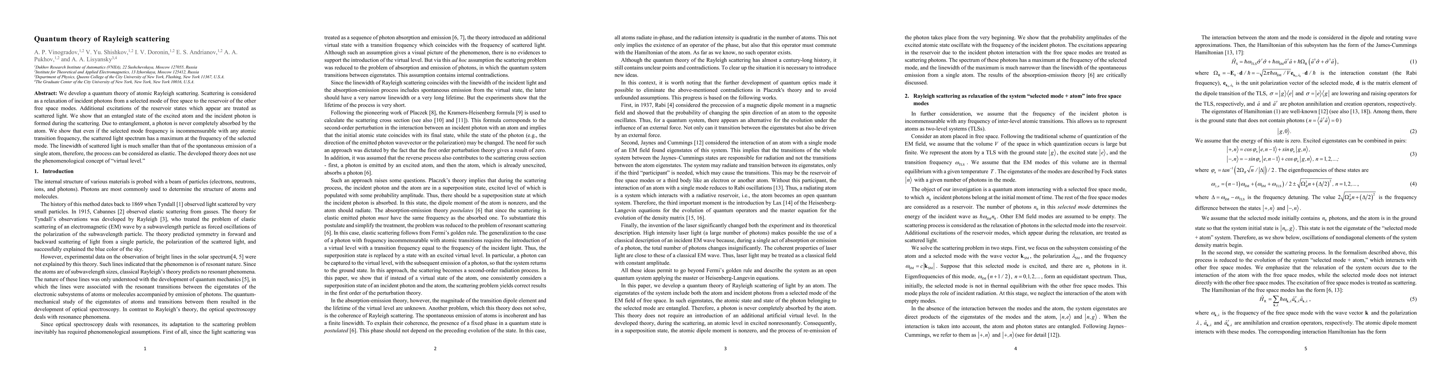 We develop a quantum theory of atomic Rayleigh scattering. Scattering is considered as a relaxation of incident photons from a selected mode of free space to the reservoir of the other free space modes. Additional excitations of the reservoir states which appear are treated as scattered light. We show that an entangled state of the excited atom and the incident photon is formed during the scattering. Due to entanglement, a photon is never completely absorbed by the atom. We show that even if the selected mode frequency is incommensurable with any atomic transition frequency, the scattered light spectrum has a maximum at the frequency of the selected mode. The linewidth of scattered light is much smaller than that of the spontaneous emission of a single atom, therefore, the process can be considered as elastic. The developed theory does not use the phenomenological concept of virtual level.