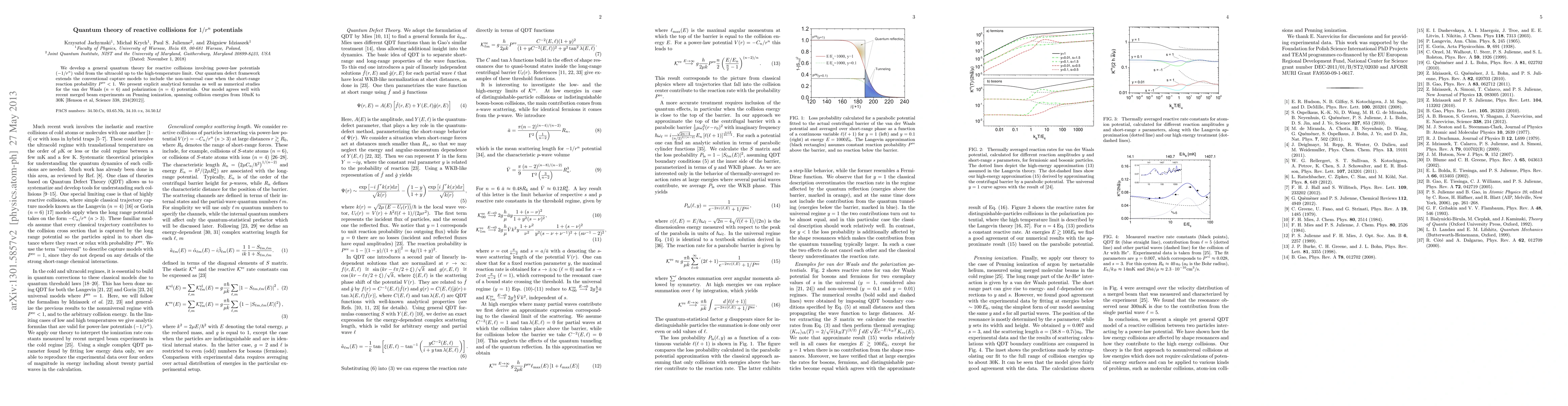 This paper develops a quantum theory for reactive collisions under power-law potentials, extending capture models to cases where reaction probability is less than one. It provides analytical and numerical results for van der Waals and polarization potentials, and connects the theory to recent Penning ionization experiments.