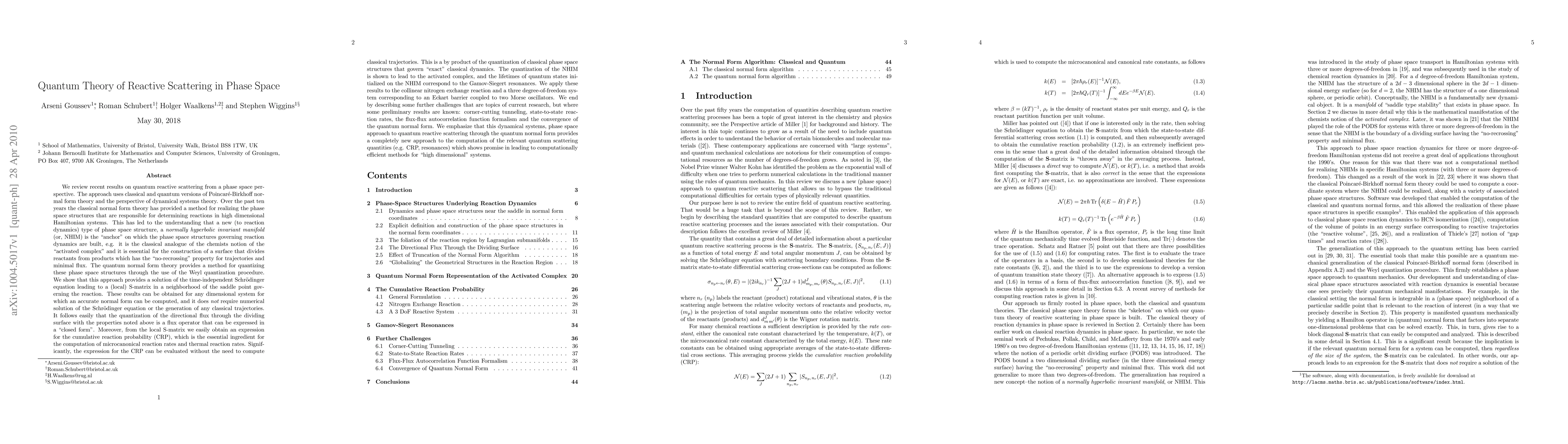 We review recent results on quantum reactive scattering from a phase space perspective. The approach uses classical and quantum versions of normal form theory and the perspective of dynamical systems theory. Over the past ten years the classical normal form theory has provided a method for realizing the phase space structures that are responsible for determining reactions in high dimensional Hamiltonian systems. This has led to the understanding that a new (to reaction dynamics) type of phase space structure, a {\em normally hyperbolic invariant manifold} (or, NHIM) is the "anchor" on which the phase space structures governing reaction dynamics are built. The quantum normal form theory provides a method for quantizing these phase space structures through the use of the Weyl quantization procedure. We show that this approach provides a solution of the time-independent Schr\"odinger equation leading to a (local) S-matrix in a neighborhood of the saddle point governing the reaction. It follows easily that the quantization of the directional flux through the dividing surface with the properties noted above is a flux operator that can be expressed in a "closed form". Moreover, from the local S-matrix we easily obtain an expression for the cumulative reactio probability (CRP). Significantly, the expression for the CRP can be evaluated without the need to compute classical trajectories. The quantization of the NHIM is shown to lead to the activated complex, and the lifetimes of quantum states initialized on the NHIM correspond to the Gamov-Siegert resonances. We apply these results to the collinear nitrogen exchange reaction and a three degree-of-freedom system corresponding to an Eckart barrier coupled to two Morse oscillators.