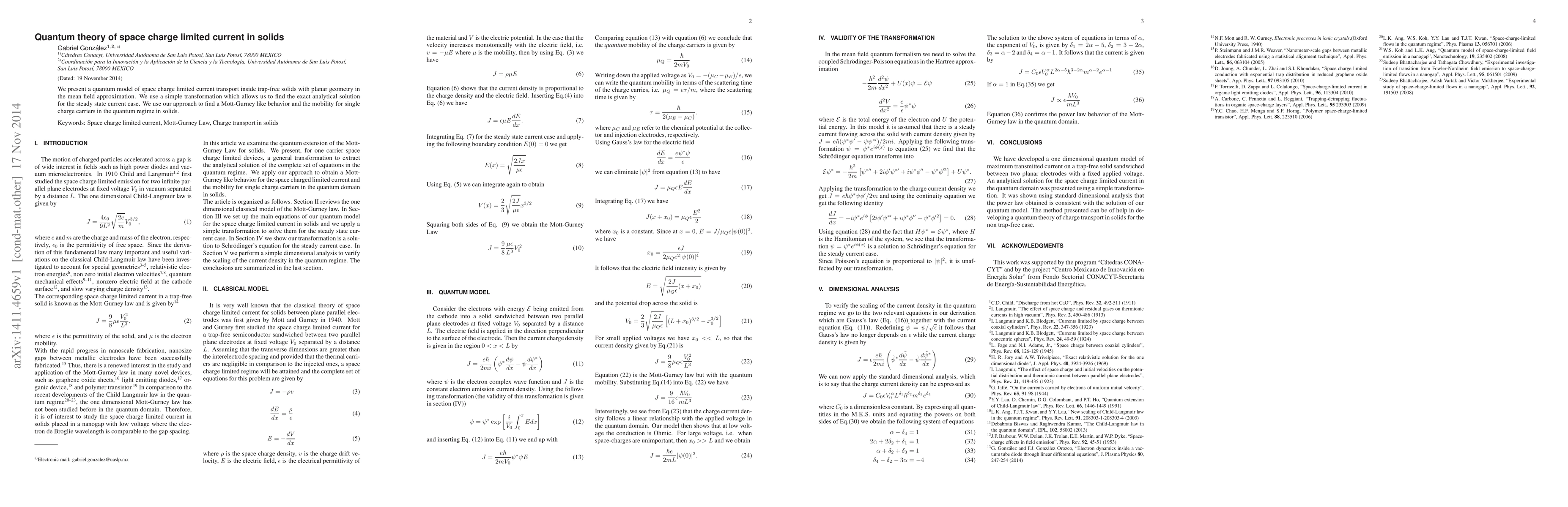 This paper develops a quantum model for space charge limited current in trap-free solids, achieving an exact analytical solution for steady-state current. The study reveals Mott-Gurney behavior and calculates mobility for single charge carriers in the quantum regime.