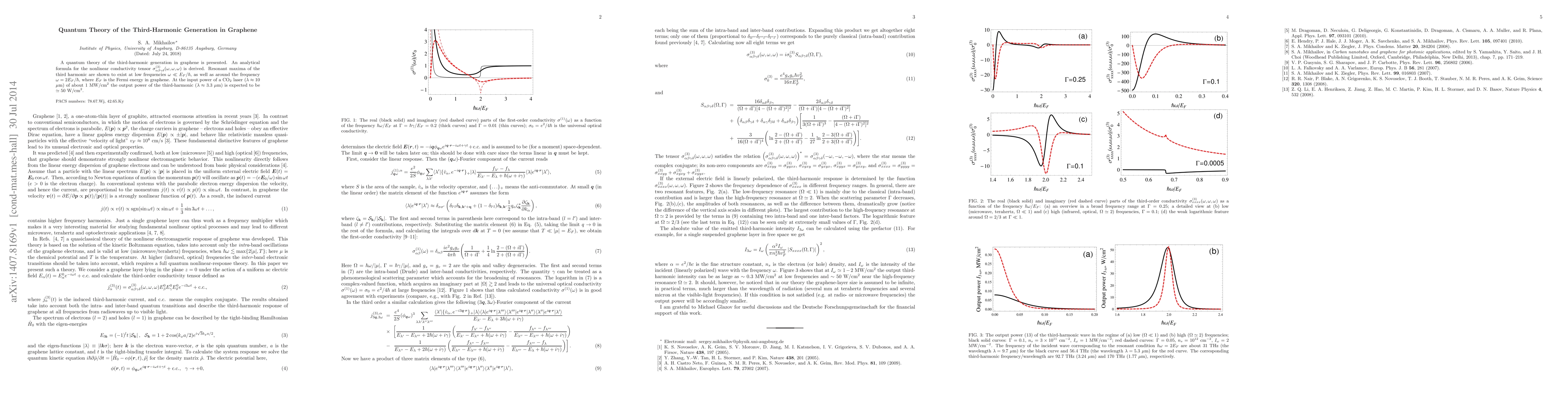 This paper presents a quantum theory for third-harmonic generation in graphene, deriving an analytical formula for its nonlinear conductivity tensor. It predicts resonant maxima at low frequencies and around $\omega=2E_F/\hbar$, estimating an output power of approximately 50 W/cm² for a CO$_2$ laser input at 1 MW/cm².