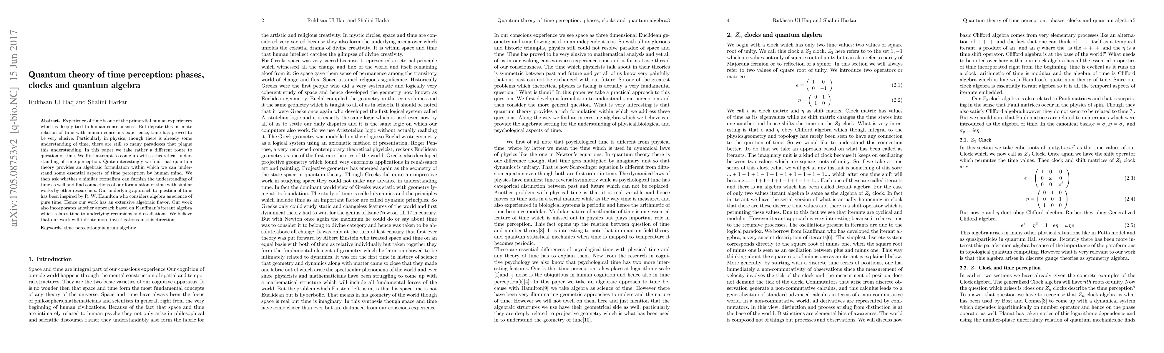Experience of time is one of the primordial human experiences which is deeply tied to human consciousness. But despite this intimate relation of time with human conscious experience, time has proved to be very elusive. Particularly in physics, though there is already some understanding of time, there are still so many paradoxes that plague this understanding. In this paper we take rather a different route to question of time. We first attempt to come up with a theoretical understanding of time perception. Quite interestingly we find that quantum theory provides an algebraic formulation within which we can understand some essential aspects of time perception by human mind. We then ask whether a similar formalism can furnish the understanding of time as well and find connections of our formulation of time with similar works by other researchers. Our underlying approach to question of time has been inspired by R. W. Hamilton who considers algebra as science of pure time. Hence our work has an extensive algebraic flavor. Our work also incorporates another approach based on Kauffman's iterant algebra which relates time to underlying recursions and oscillations. We believe that our work will initiate more investigations in this direction.