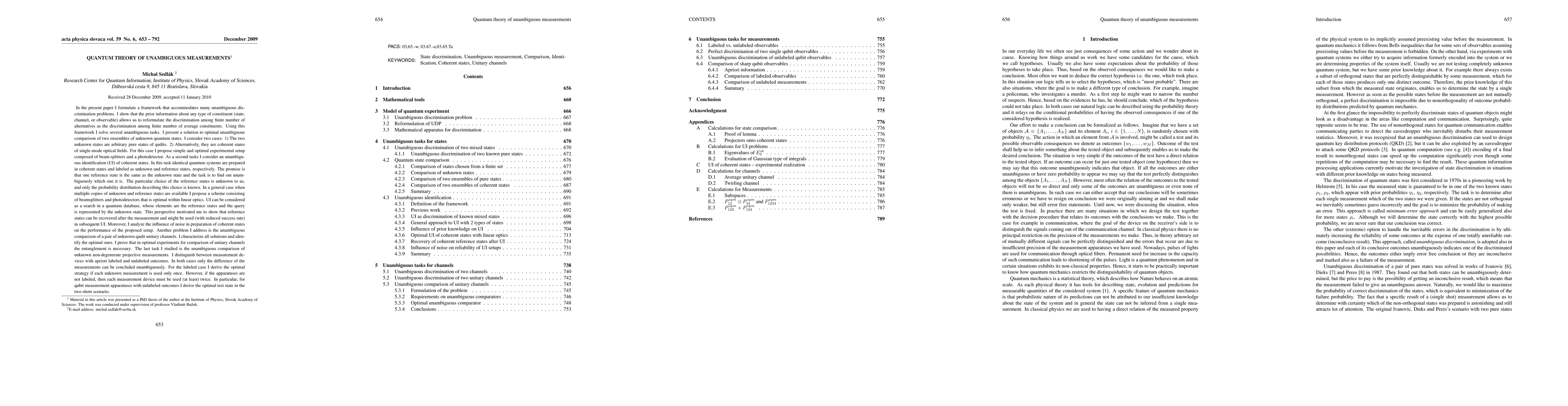This paper develops a framework for unambiguous quantum measurements, addressing various discrimination tasks. It proposes optimal solutions for comparing unknown quantum states and channels, and introduces a linear optics setup for identifying coherent states, demonstrating the necessity of entanglement in optimal unitary channel comparisons.