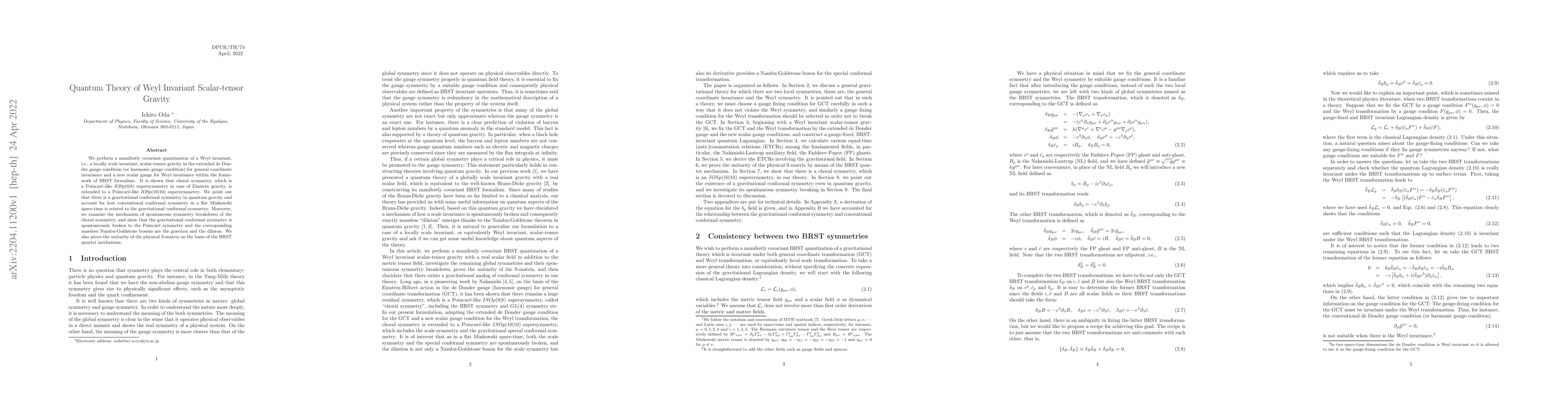 This paper quantizes Weyl invariant scalar-tensor gravity using BRST formalism, extending choral symmetry to a higher supersymmetry and demonstrating the spontaneous breakdown of gravitational conformal symmetry, resulting in graviton and dilaton as massless Nambu-Goldstone bosons, while proving the unitarity of the physical S-matrix.