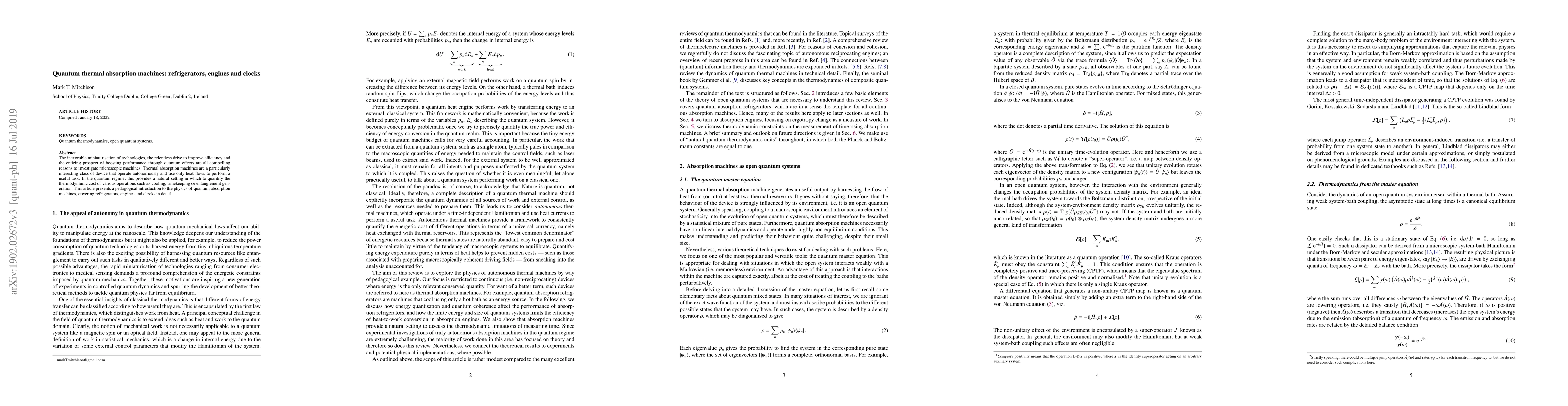 The inexorable miniaturisation of technologies, the relentless drive to improve efficiency and the enticing prospect of boosting performance through quantum effects are all compelling reasons to investigate microscopic machines. Thermal absorption machines are a particularly interesting class of device that operate autonomously and use only heat flows to perform a useful task. In the quantum regime, this provides a natural setting in which to quantify the thermodynamic cost of various operations such as cooling, timekeeping or entanglement generation. This article presents a pedagogical introduction to the physics of quantum absorption machines, covering refrigerators, engines and clocks in detail.