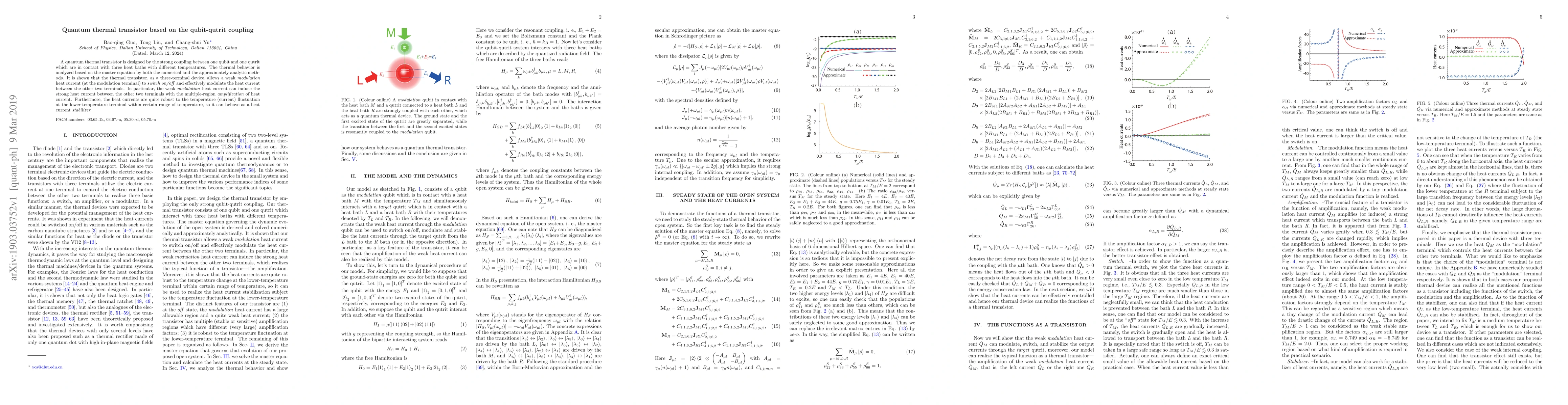A quantum thermal transistor, utilizing strong coupling between a qubit and a qutrit in contact with three heat baths, is designed and analyzed. It demonstrates the ability to control heat currents via weak modulation, acting as a heat current stabilizer within certain temperature ranges.