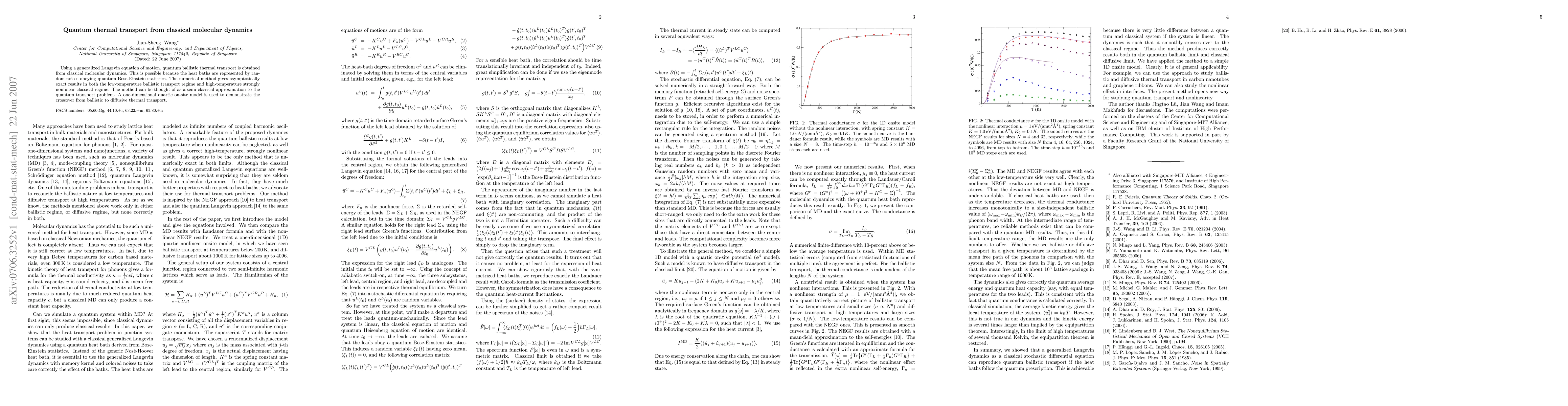 This paper presents a method to simulate quantum thermal transport using classical molecular dynamics, employing a generalized Langevin equation with quantum Bose-Einstein statistics for heat baths. The approach provides accurate results across both low-temperature ballistic and high-temperature classical regimes, demonstrating a semi-classical approximation for quantum transport through a one-dimensional quartic model.