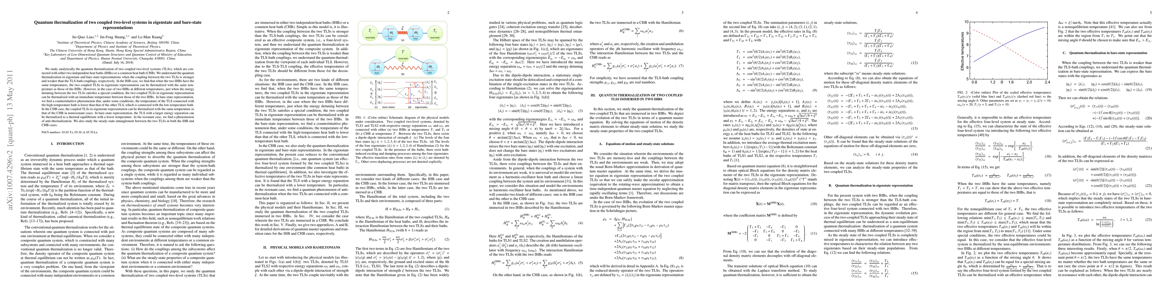 This research analytically explores the quantum thermalization of two coupled two-level systems interacting with either separate or shared heat baths. Key findings include thermalization at intermediate temperatures under specific conditions, counterintuitive temperature disparities in bare-state representation, and anti-thermalization in resonant cases with a common heat bath. The study also examines steady-state entanglement between the coupled systems.