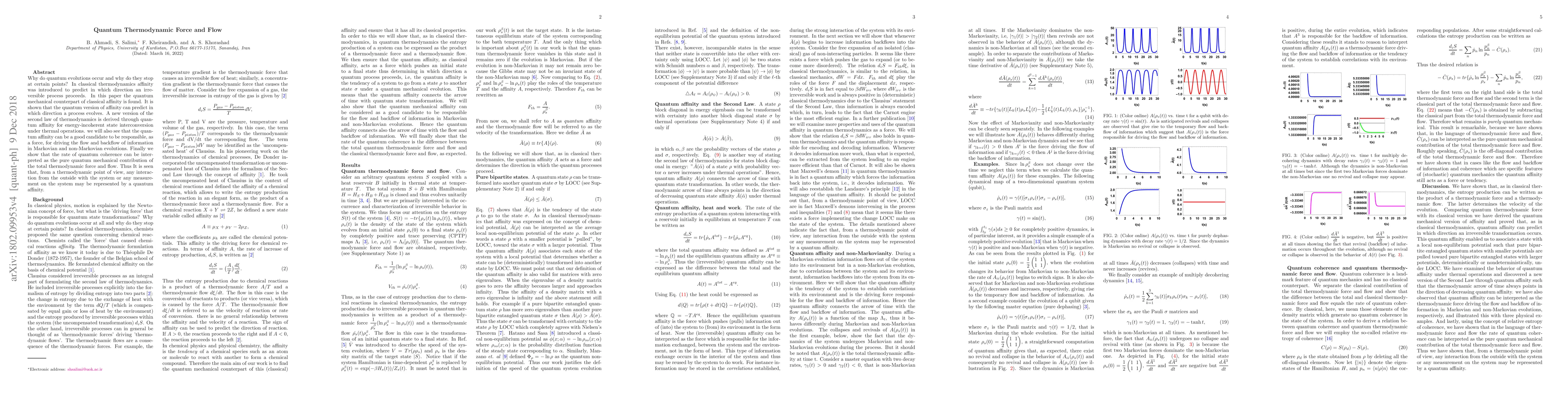 Why do quantum evolutions occur and why do they stop at certain points? In classical thermodynamics affinity was introduced to predict in which direction an irreversible process proceeds. In this paper the quantum mechanical counterpart of classical affinity is found. It is shown that the quantum version of affinity can predict in which direction a process evolves. A new version of the second law of thermodynamics is derived through quantum affinity for energy-incoherent state interconversion under thermal operations. we will also see that the quantum affinity can be a good candidate to be responsible, as a force, for driving the flow and backflow of information in Markovian and non-Markovian evolutions. Finally we show that the rate of quantum coherence can be interpreted as the pure quantum mechanical contribution of the total thermodynamic force and flow. Thus It is seen that, from a thermodynamic point of view, any interaction from the outside with the system or any measurement on the system may be represented by a quantum affinity.
