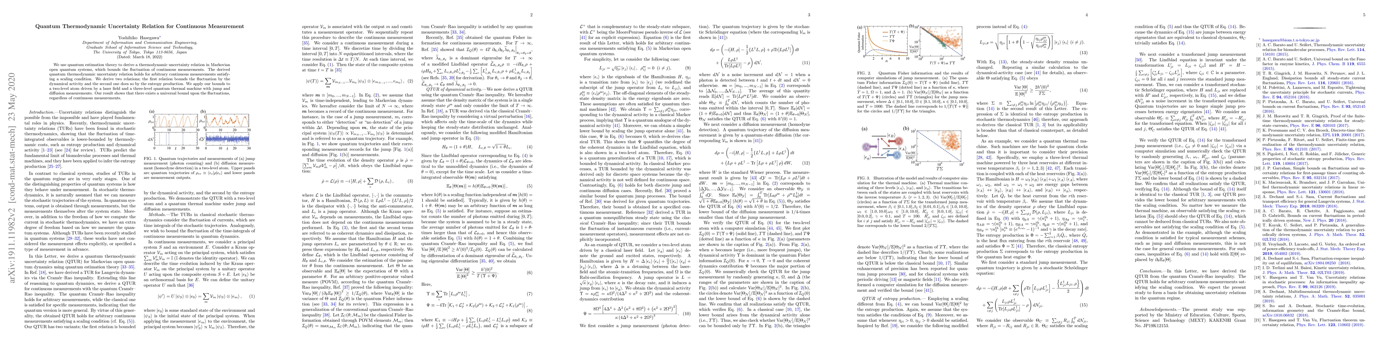 This paper derives a quantum thermodynamic uncertainty relation for continuous measurements in open quantum systems, establishing bounds on measurement fluctuations based on dynamical activity and entropy production. The findings apply universally, demonstrated through examples of a two-level atom and a three-level quantum thermal machine.