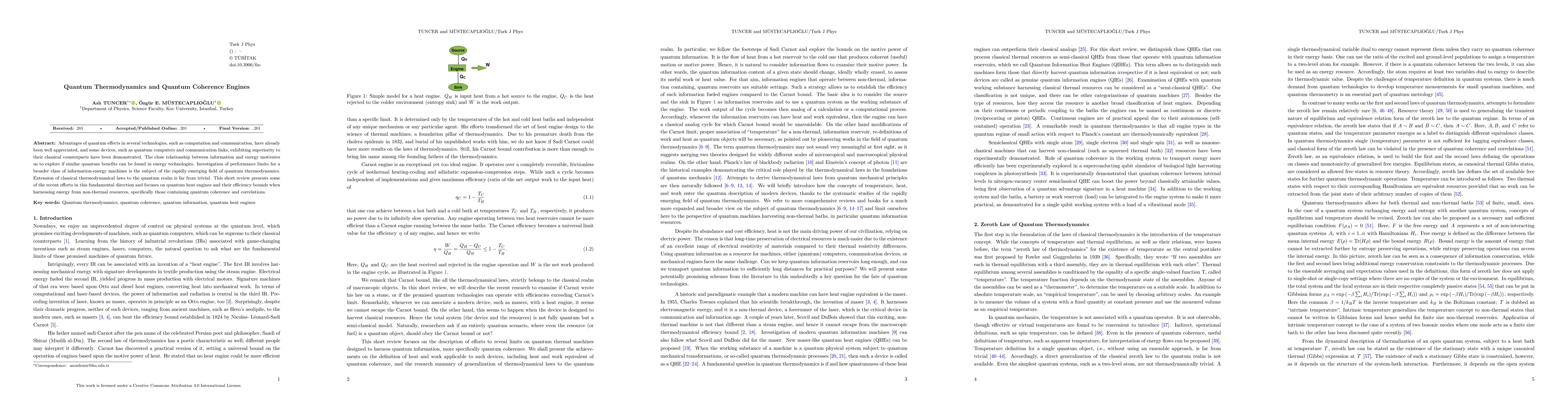 The paper provides a comprehensive review of quantum thermodynamics, including extensions of classical thermodynamic laws to the quantum domain, and the role of quantum coherences in powering quantum heat engines.