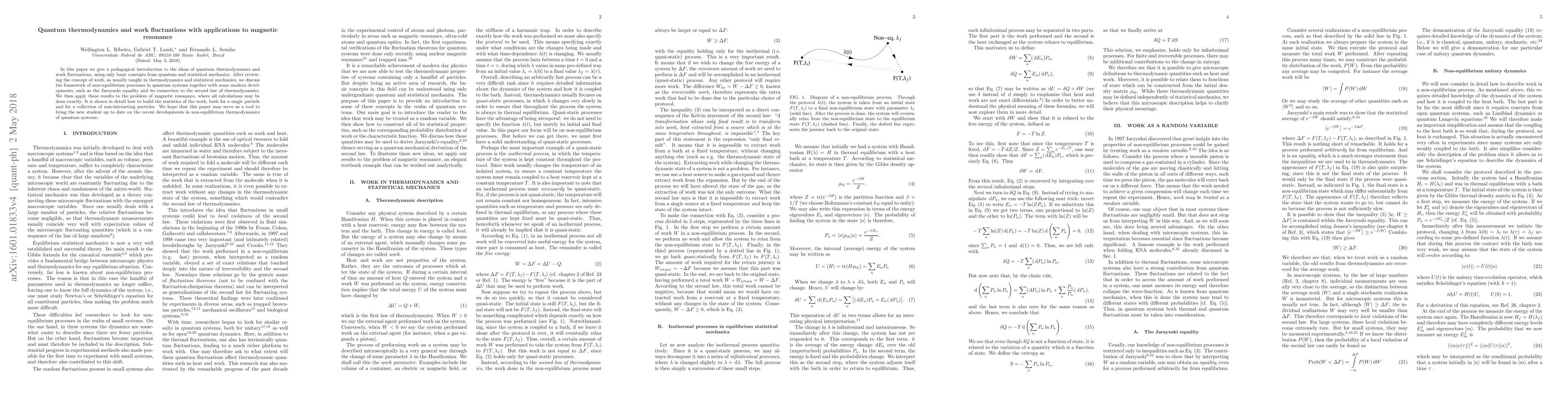 This paper provides a basic introduction to quantum thermodynamics and work fluctuations, focusing on non-equilibrium processes and modern developments like the Jarzynski equality. It applies these concepts to magnetic resonance, offering exact calculations and detailed statistics on work for both single and multiple particles.