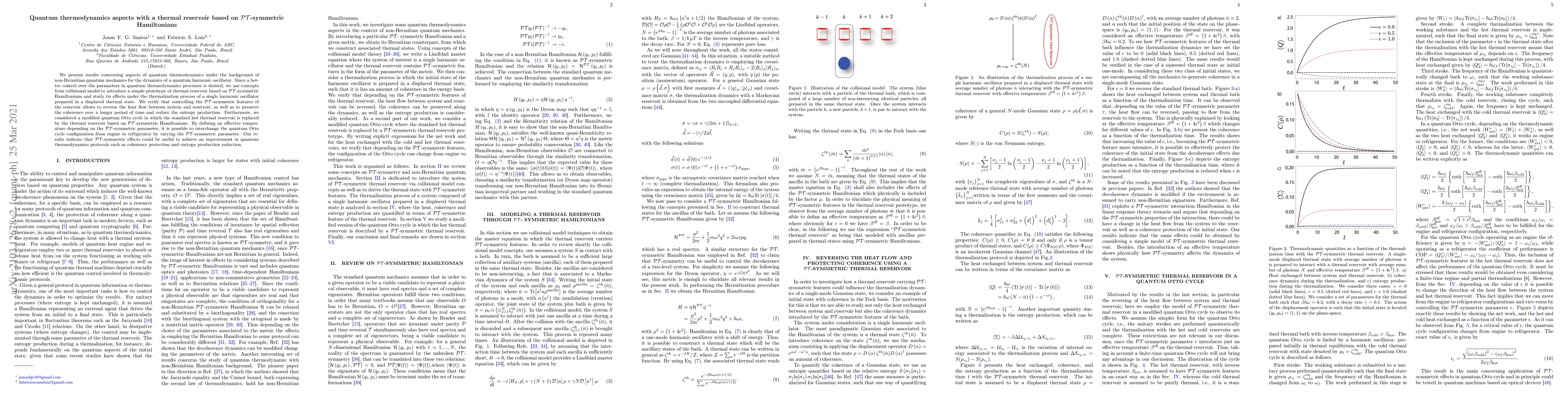 This paper explores quantum thermodynamics using $\mathcal{PT}$-symmetric Hamiltonians, demonstrating how a thermal reservoir based on these Hamiltonians can reverse heat flow, preserve coherence, and reduce entropy production in a quantum harmonic oscillator. It also shows that a modified quantum Otto cycle can switch between engine and refrigerator modes by altering the $\mathcal{PT}$-symmetric parameter.
