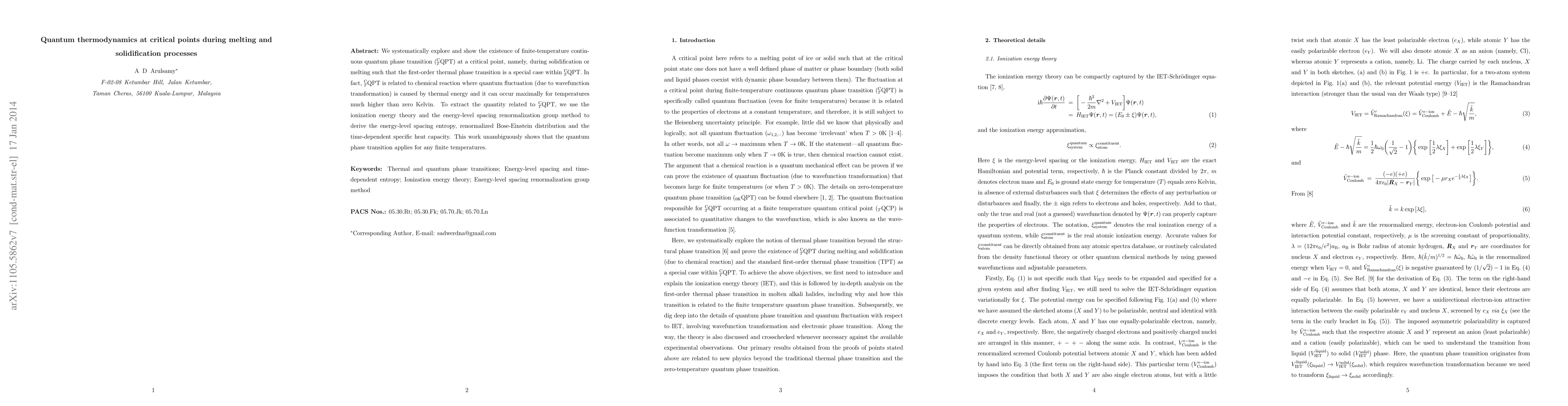 The research systematically explores finite-temperature continuous quantum phase transitions (CTQPT) during melting and solidification processes, using ionization energy theory and energy-level spacing renormalization group method to derive entropy, renormalized Bose-Einstein distribution, and time-dependent specific heat capacity.