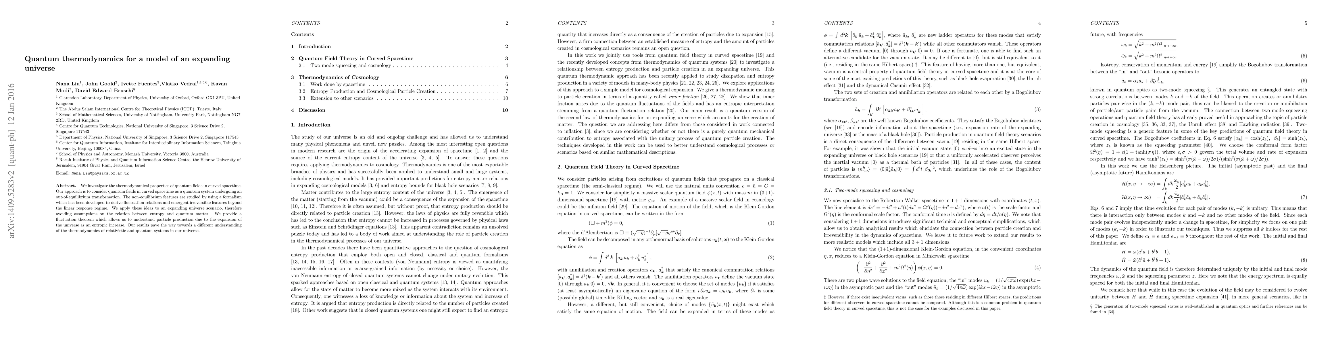 This paper explores the thermodynamic properties of quantum fields in an expanding universe, treating them as out-of-equilibrium systems. It introduces a fluctuation theorem to understand particle production as an entropic increase, offering new insights into the thermodynamics of relativistic and quantum systems.