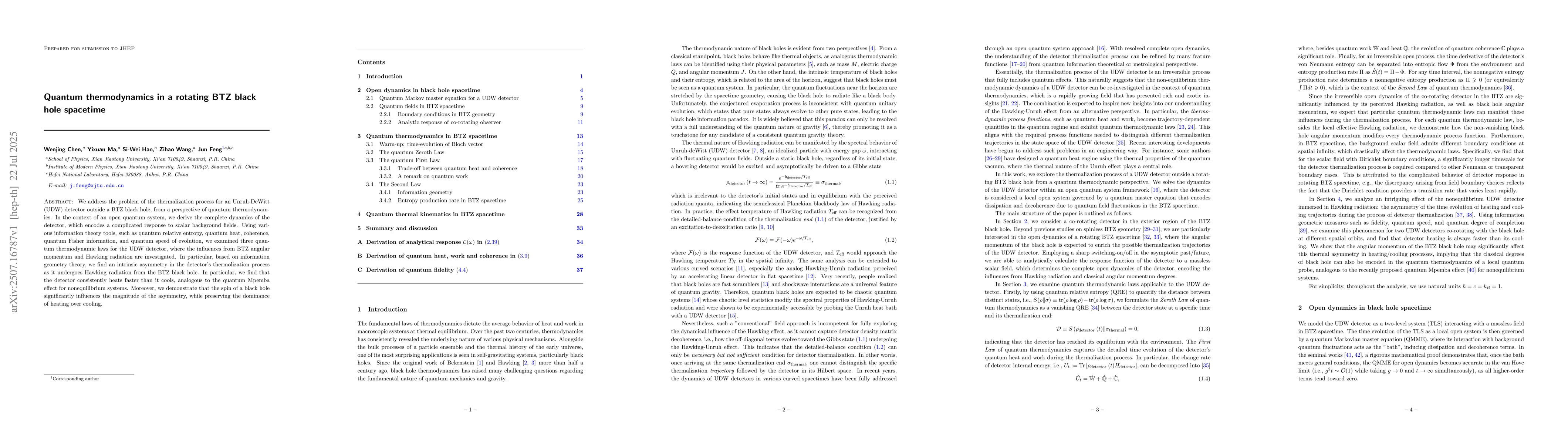 The paper derives the complete dynamics of a UDW detector in a rotating BTZ black hole spacetime and examines three quantum thermodynamic laws, introducing an information geometry perspective to analyze the asymmetry in thermalization.
