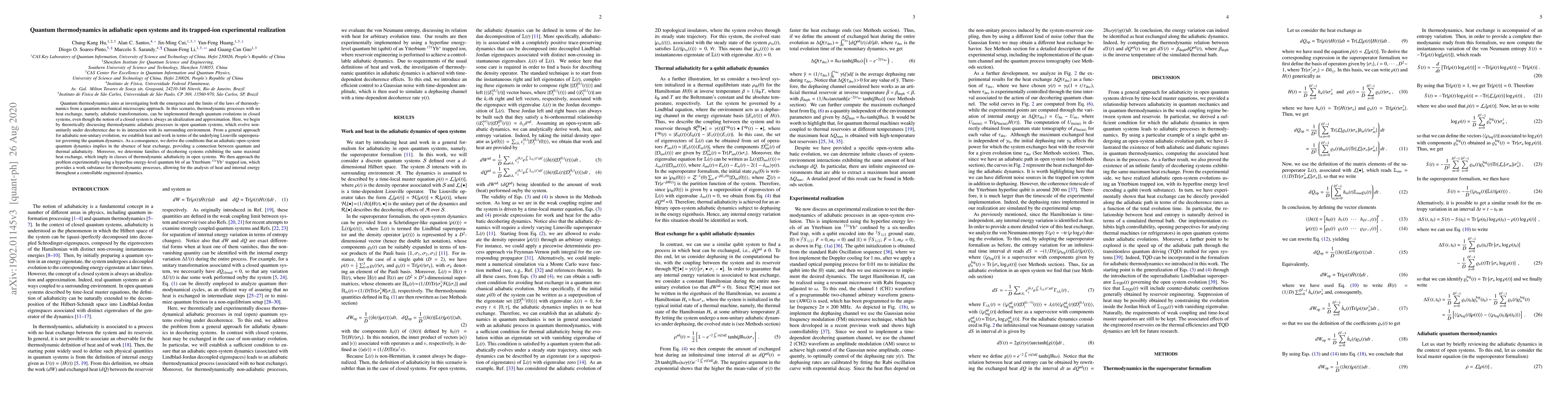 This paper theoretically explores adiabatic processes in open quantum systems, establishing conditions for thermodynamic adiabaticity without heat exchange, and experimentally realizes these concepts using a trapped Ytterbium ion to analyze heat and internal energy.