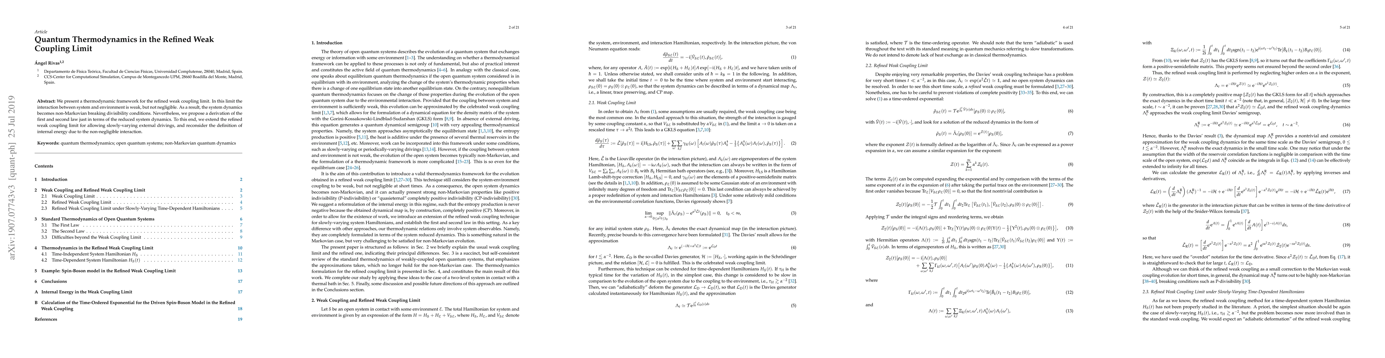 This paper develops a thermodynamic framework for the refined weak coupling limit, where weak but significant interactions lead to non-Markovian dynamics. It proposes a method to derive the first and second laws of thermodynamics based on the reduced system dynamics, extending the framework to accommodate slowly-varying external influences and redefining internal energy.