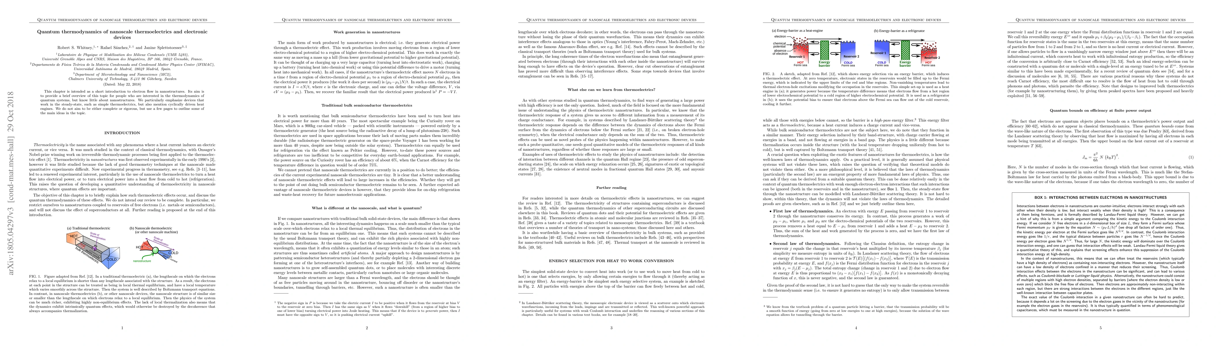 This mini-review is intended as a short introduction to electron flow in nanostructures. Its aim is to provide a brief overview of this topic for people who are interested in the thermodynamics of quantum systems but know little about nanostructures. We particularly emphasize devices that work in the steady-state, such as simple thermoelectrics, but also mention cyclically driven heat engines. We do not aim to be either complete or rigorous, but use a few pages to outline some of the main ideas in the topic.
