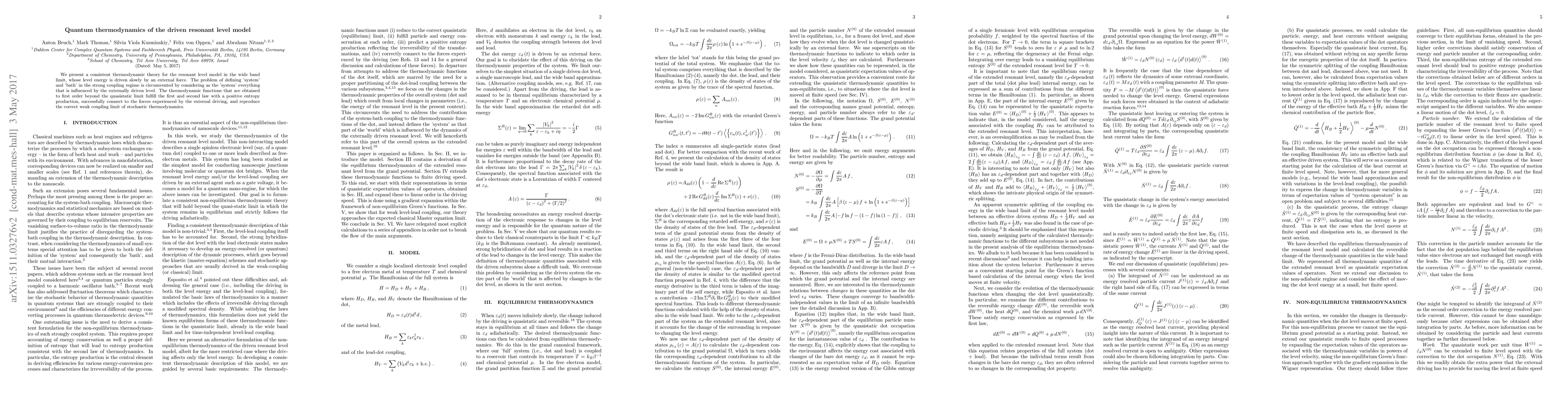 This paper develops a thermodynamic theory for the driven resonant level model in the wide band limit, defining the 'system' as everything influenced by the external force. It successfully connects thermodynamic laws to the external driving forces and reproduces the weak coupling limit of stochastic thermodynamics.