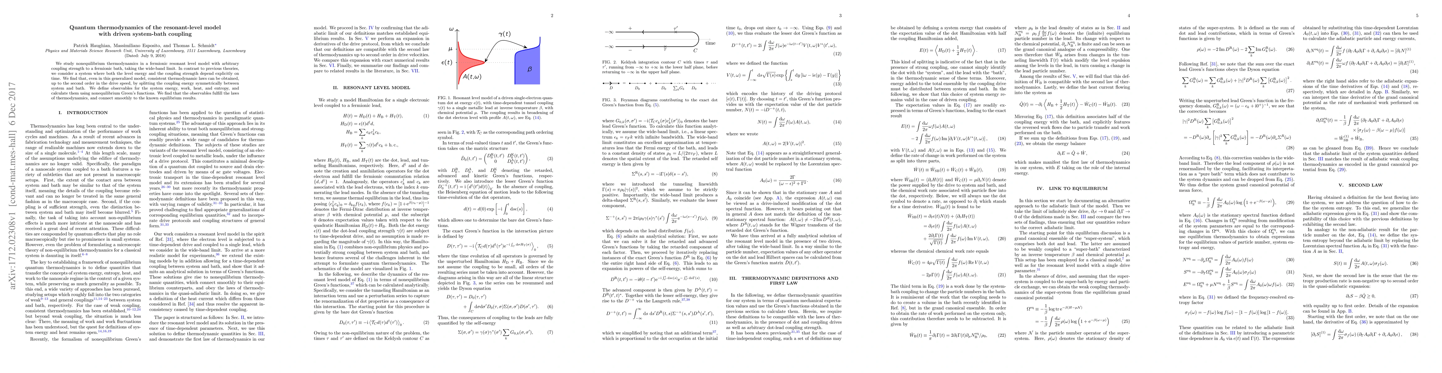 We study nonequilibrium thermodynamics in a fermionic resonant level model with arbitrary coupling strength to a fermionic bath, taking the wide-band limit. In contrast to previous theories, we consider a system where both the level energy and the coupling strength depend explicitly on time. We find that, even in this generalized model, consistent thermodynamic laws can be obtained, up to the second order in the drive speed, by splitting the coupling energy symmetrically between system and bath. We define observables for the system energy, work, heat, and entropy, and calculate them using nonequilibrium Green's functions. We find that the observables fulfill the laws of thermodynamics, and connect smoothly to the known equilibrium results.