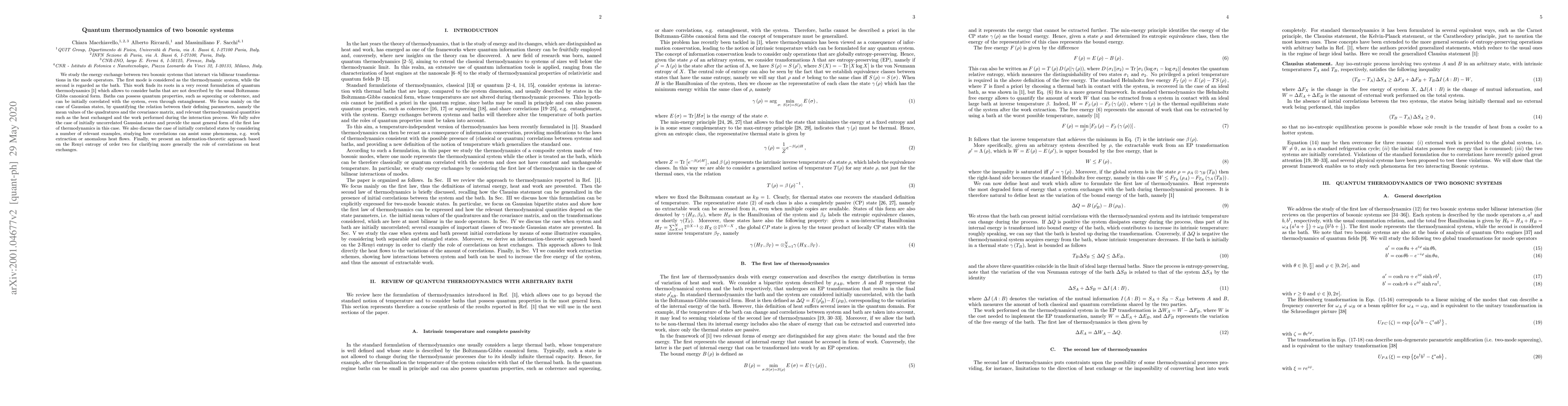 The paper presents detailed derivations and solutions for the first law of thermodynamics in the context of two interacting bosonic systems, considering both uncorrelated and correlated Gaussian states, and introduces an information-theoretic approach using Renyi entropy.