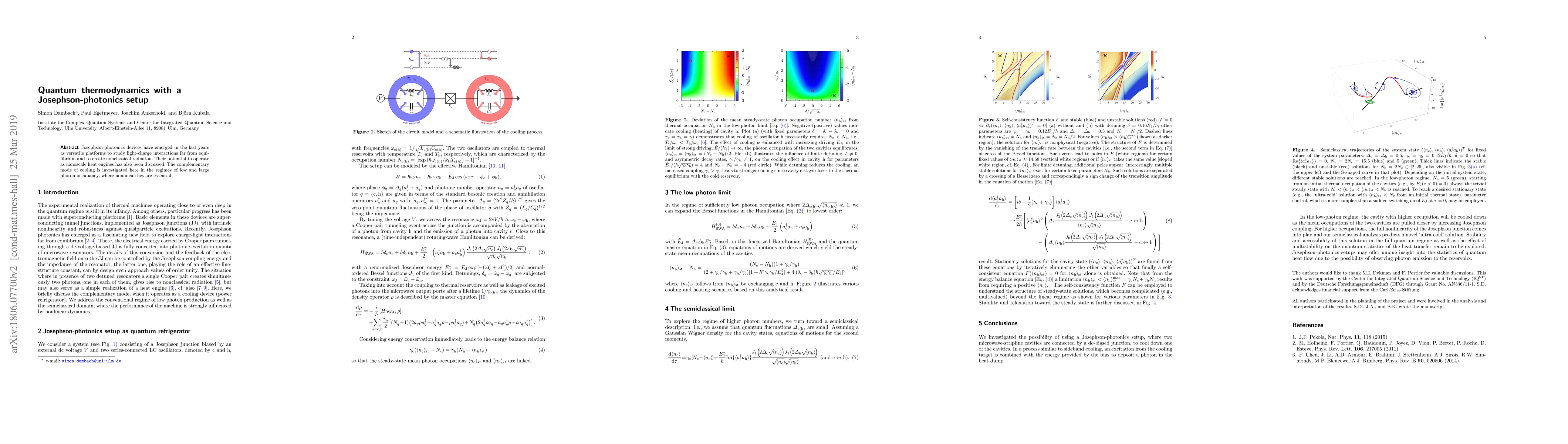 This paper explores the use of Josephson-photonics devices to study quantum thermodynamics, focusing on their potential as nanoscale heat engines and the complementary mode of cooling in both low and high photon occupancy regimes, emphasizing the role of nonlinearities.