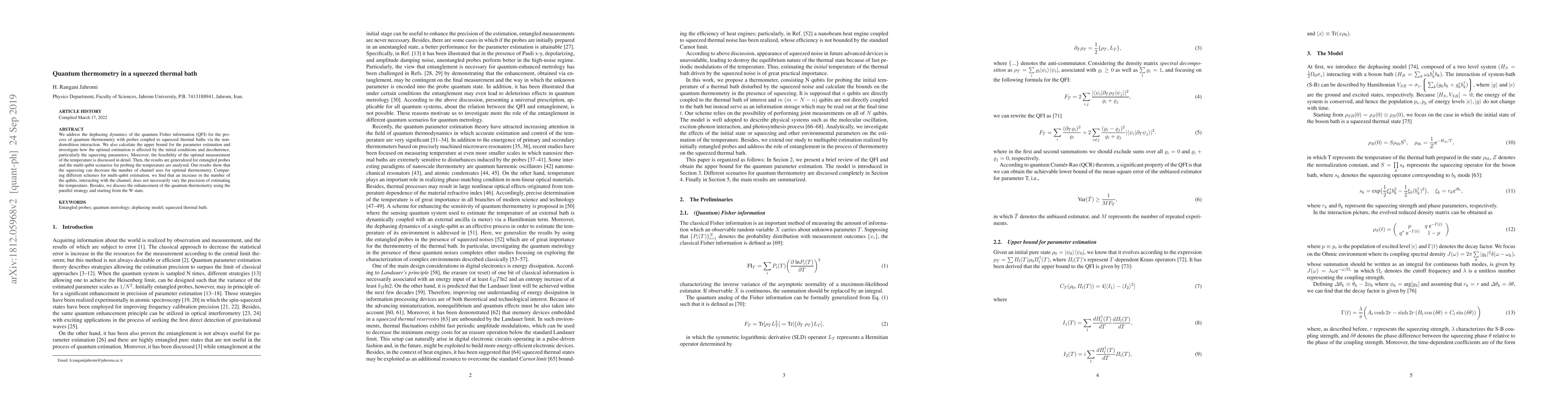 We address the dephasing dynamics of the quantum Fisher information (QFI) for the process of quantum thermometry with probes coupled to squeezed thermal baths via the nondemolition interaction. We also calculate the upper bound for the parameter estimation and investigate how the optimal estimation is affected by the initial conditions and decoherence, particularly the squeezing parameters. Moreover, the feasibility of the optimal measurement of the temperature is discussed in detail. Then, the results are generalized for entangled probes and the multi-qubit scenarios for probing the temperature are analysed. Our results show that the squeezing can decrease the number of channel uses for optimal thermometry. Comparing different schemes for multi-qubit estimation, we find that an increase in the number of the qubits, interacting with the channel, does not necessarily vary the precision of estimating the temperature. Besides, we discuss the enhancement of the quantum thermometry using the parallel strategy and starting from the W state.