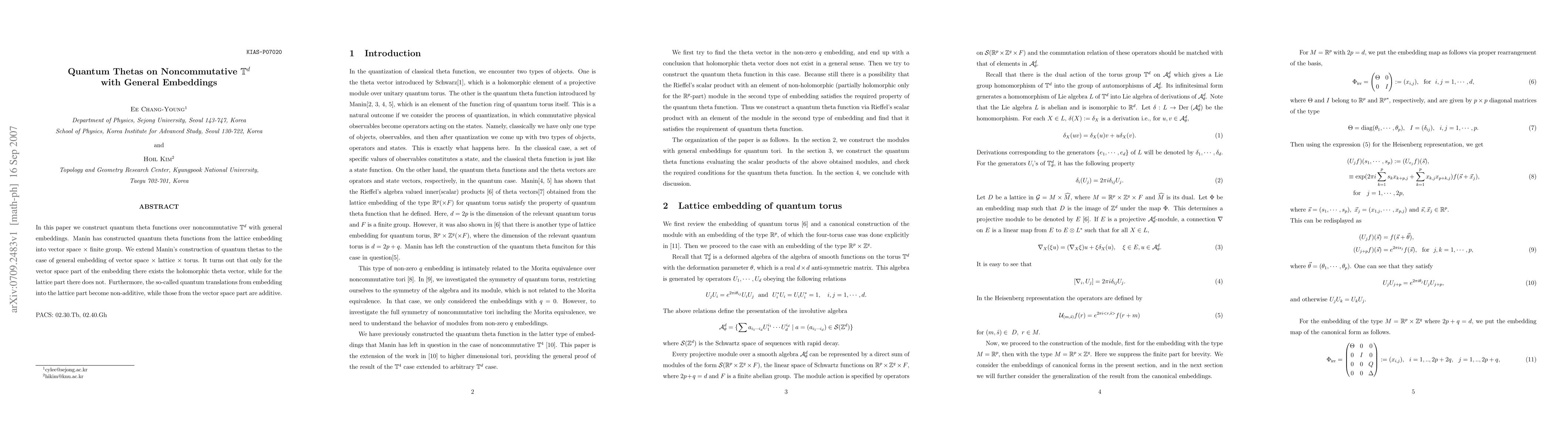 In this paper we construct quantum theta functions over noncommutative T^d with general embeddings. Manin has constructed quantum theta functions from the lattice embedding into vector space x finite group. We extend Manin's construction of quantum thetas to the case of general embedding of vector space x lattice x torus. It turns out that only for the vector space part of the embedding there exists the holomorphic theta vector, while for the lattice part there does not. Furthermore, the so-called quantum translations from embedding into the lattice part become non-additive, while those from the vector space part are additive.