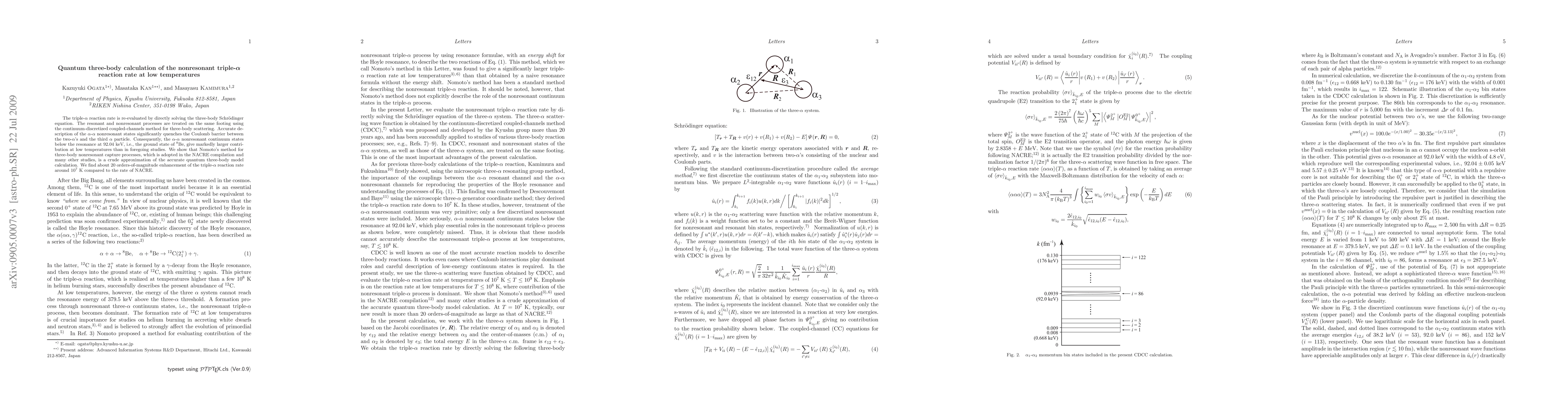 This paper re-evaluates the triple-alpha reaction rate by solving the three-body Schrödinger equation, revealing that nonresonant processes significantly enhance the reaction rate at low temperatures, providing a much larger contribution than previously estimated. The study shows that Nomoto's method is a poor approximation compared to the accurate quantum three-body model, resulting in a 20-order-of-magnitude increase in the reaction rate at around 10^7 K.