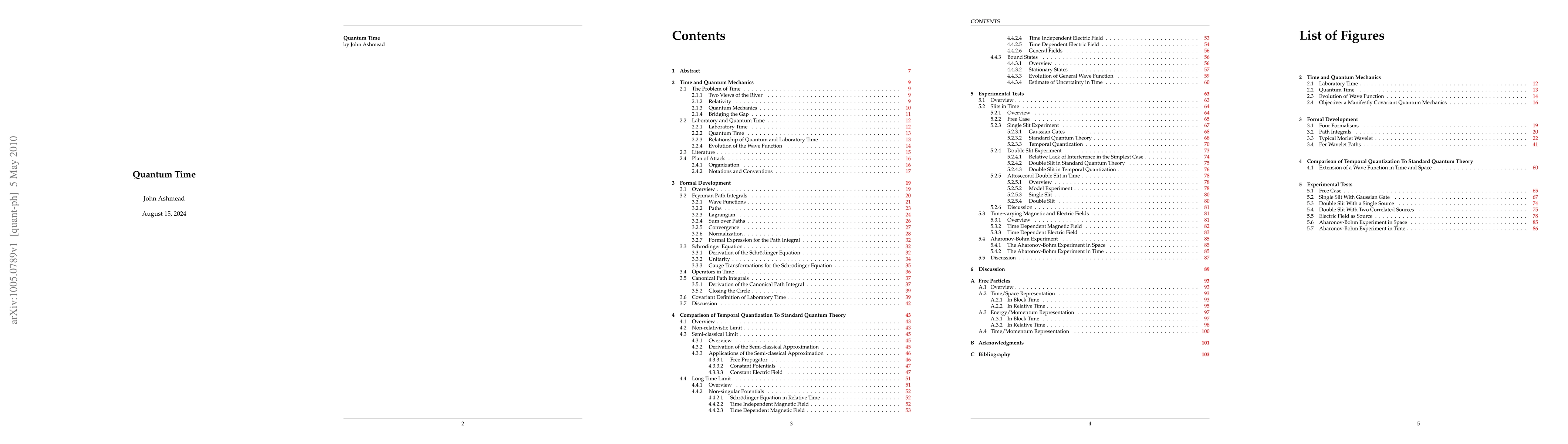 Normally we quantize along the space dimensions but treat time classically. But from relativity we expect a high level of symmetry between time and space. What happens if we quantize time using the same rules we use to quantize space? To do this, we generalize the paths in the Feynman path integral to include paths that vary in time as well as in space. We use Morlet wavelet decomposition to ensure convergence and normalization of the path integrals. We derive the Schr\"odinger equation in four dimensions from the short time limit of the path integral expression. We verify that we recover standard quantum theory in the non-relativistic, semi-classical, and long time limits. Quantum time is an experiment factory: most foundational experiments in quantum mechanics can be modified in a way that makes them tests of quantum time. We look at single and double slits in time, scattering by time-varying electric and magnetic fields, and the Aharonov-Bohm effect in time.