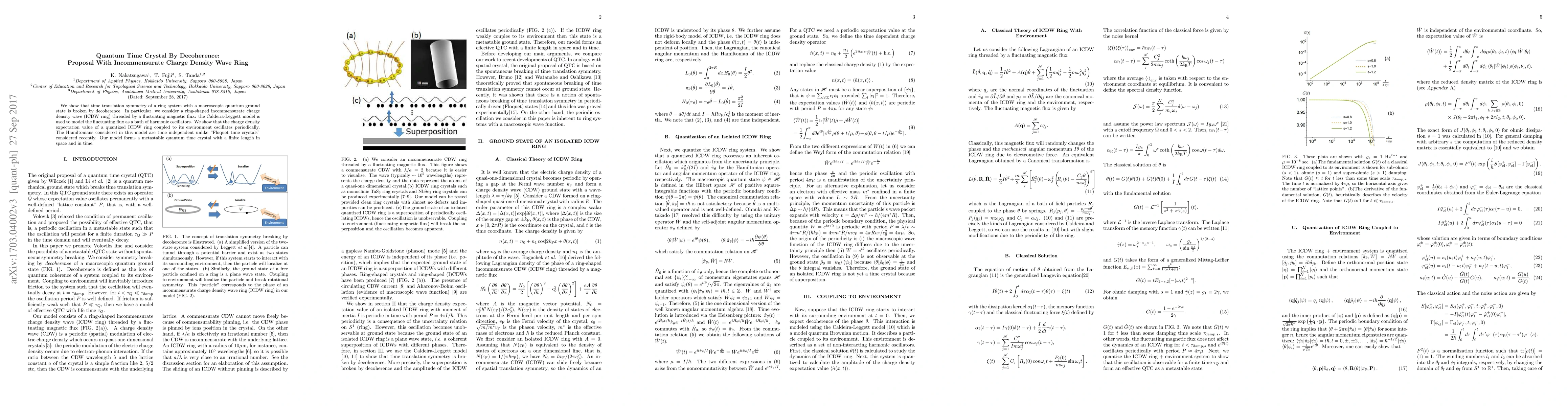 We show that time translation symmetry of a ring system with a macroscopic quantum ground state is broken by decoherence. In particular, we consider a ring-shaped incommensurate charge density wave (ICDW ring) threaded by a fluctuating magnetic flux: the Caldeira-Leggett model is used to model the fluctuating flux as a bath of harmonic oscillators. We show that the charge density expectation value of a quantized ICDW ring coupled to its environment oscillates periodically. The Hamiltonians considered in this model are time independent unlike "Floquet time crystals" considered recently. Our model forms a metastable quantum time crystal with a finite length in space and in time.