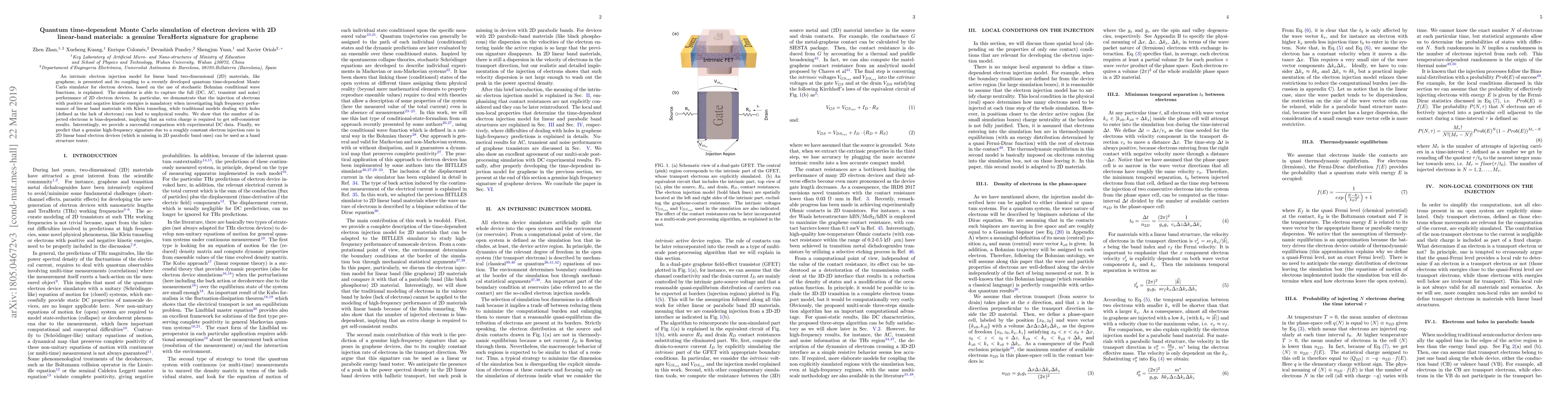 An intrinsic electron injection model for linear band two-dimensional (2D) materials, like graphene, is presented and its coupling to a recently developed quantum time-dependent Monte Carlo simulator for electron devices, based on the use of stochastic Bohmian conditional wave functions, is explained. The simulator is able to capture the full (DC, AC, transient and noise) performance of 2D electron devices. In particular, we demonstrate that the injection of electrons with positive and negative kinetic energies is mandatory when investigating high frequency performance of linear band materials with Klein tunneling, while traditional models dealing with holes (defined as the lack of electrons) can lead to unphysical results. We show that the number of injected electrons is bias-dependent, implying that an extra charge is required to get self-consistent results. Interestingly, we provide a successful comparison with experimental DC data. Finally, we predict that a genuine high-frequency signature due to a roughly constant electron injection rate in 2D linear band electron devices (which is missing in 2D parabolic band ones) can be used as a band structure tester.