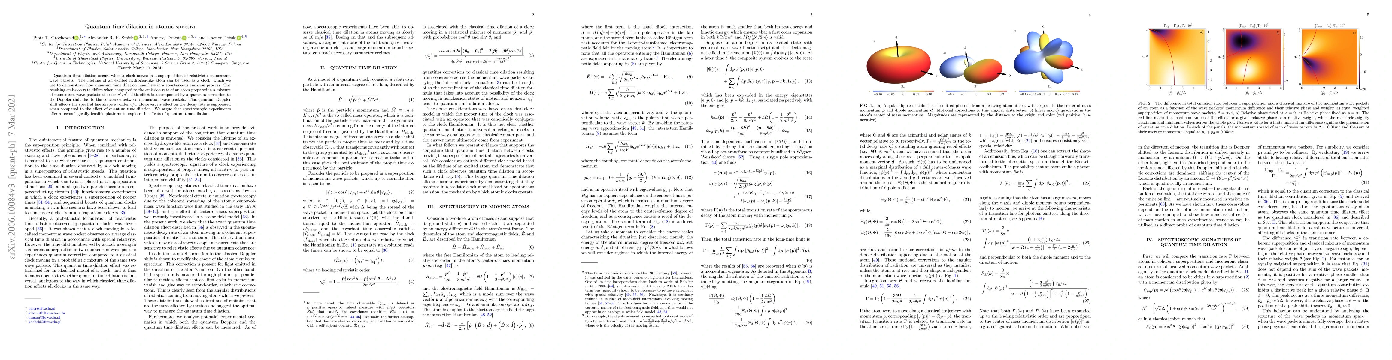 This paper demonstrates quantum time dilation in atomic spectra using the lifetime of excited hydrogen-like atoms, showing a difference in emission rates due to superposition of relativistic momentum wave packets. It also reveals a quantum correction to the Doppler shift affecting the spectral line shape, though its impact on decay rate is less significant than quantum time dilation effects.