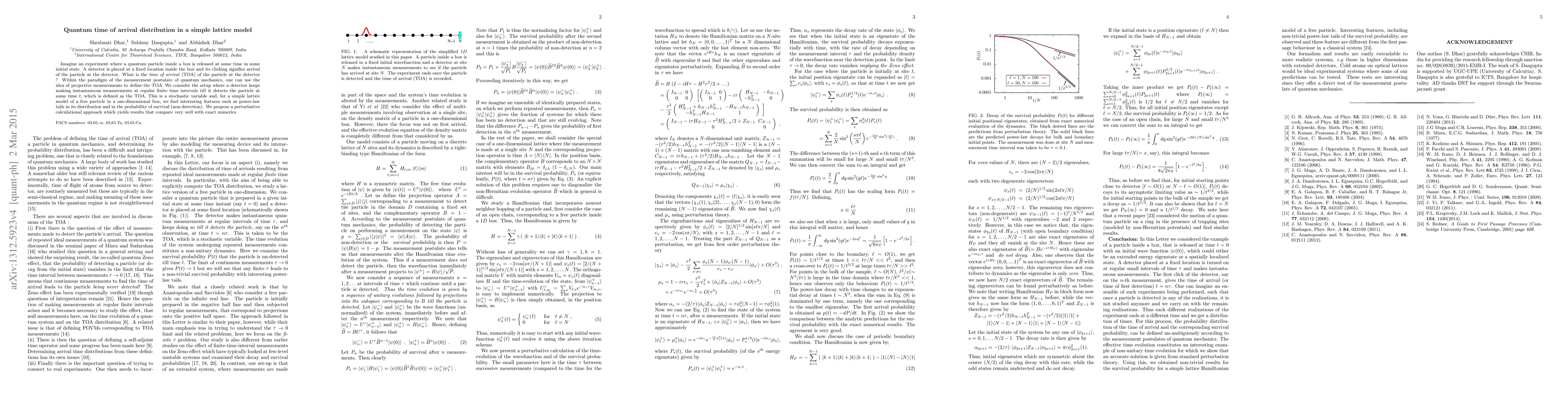 A study on a simple lattice model of a free particle in a one-dimensional box explores the distribution of time of arrival for a quantum particle detected at regular intervals. The results show power-law tails in the time of arrival distribution and probability of survival.