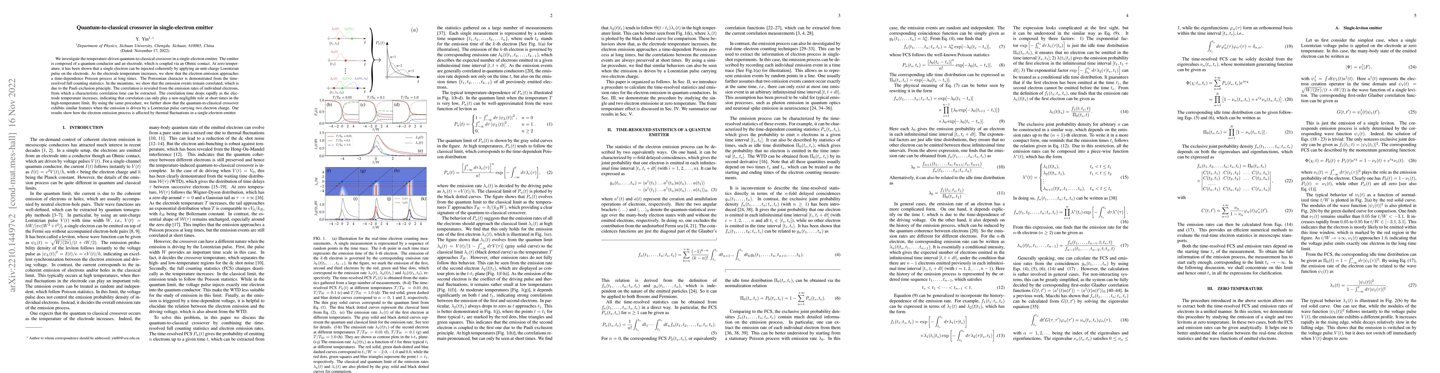 This paper investigates the quantum-to-classical crossover in a single-electron emitter as temperature increases, showing that electron emission transitions from coherent to a Poisson process at higher temperatures. Despite this, electron emission events remain correlated due to the Pauli exclusion principle, with correlation diminishing as temperature rises.
