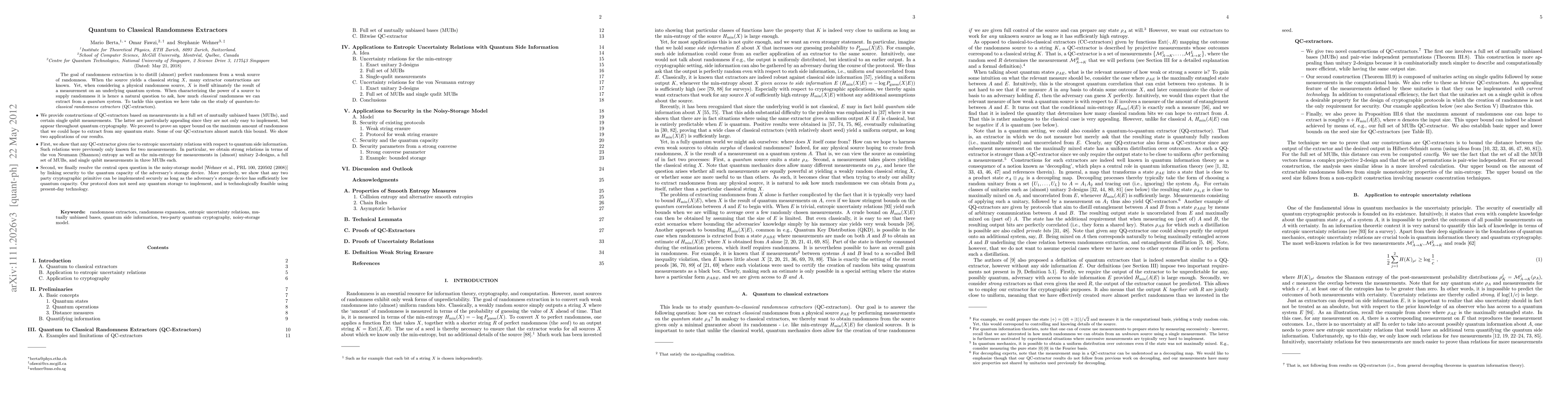 This paper explores quantum-to-classical randomness extractors (QC-extractors) that distill classical randomness from quantum sources. It constructs QC-extractors using measurements in mutually unbiased bases and single qubit measurements, and demonstrates their application in entropic uncertainty relations and resolving the security-capacity link in the noisy-storage model.