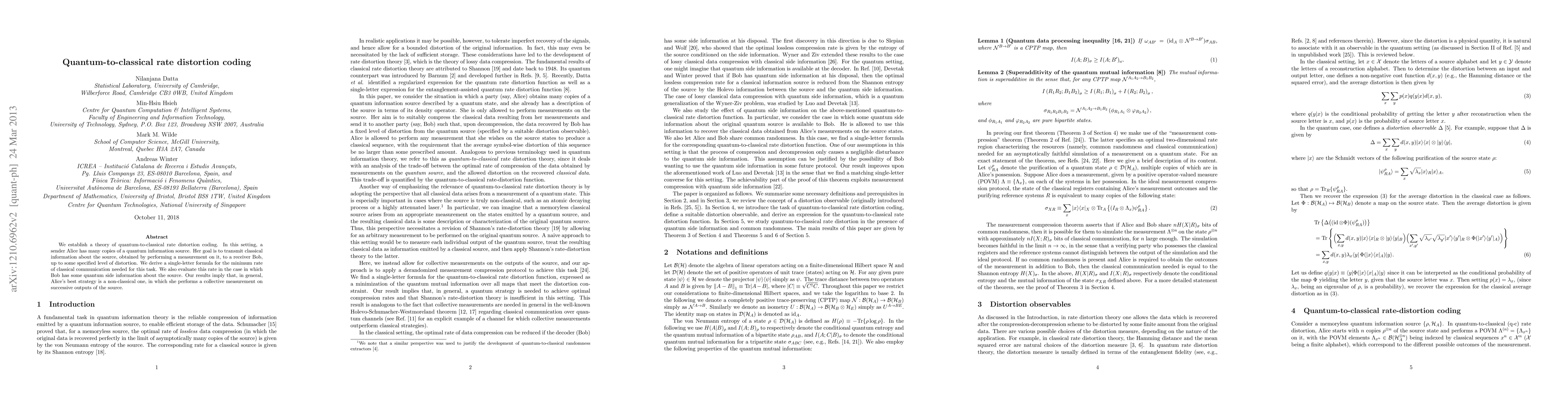 This paper develops a theory for quantum-to-classical rate distortion coding, deriving a formula for the minimum classical communication rate needed to transmit information about a quantum source with specified distortion. It finds that Alice's optimal strategy often involves non-classical collective measurements.